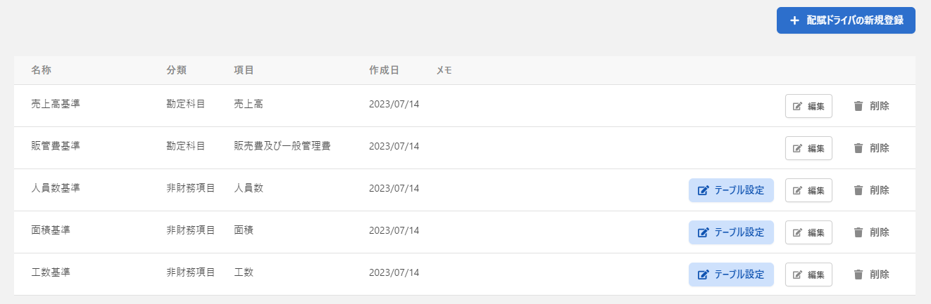 配賦計算の基準となる配賦ドライバを複数作成することが可能です。