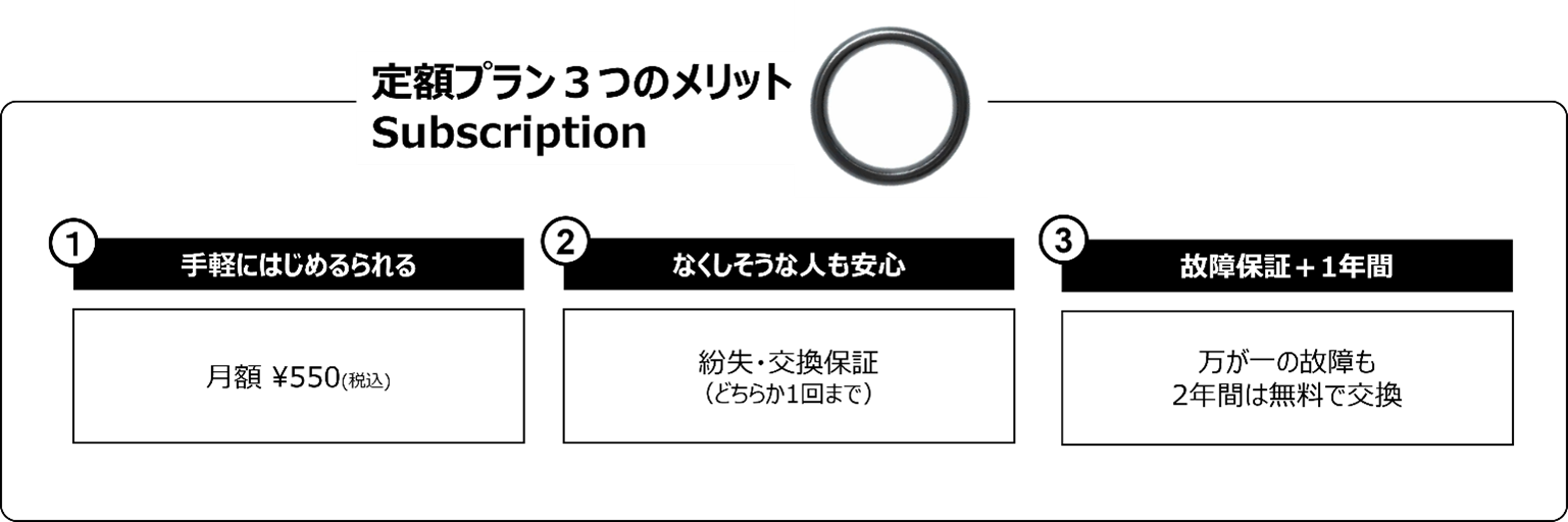 「定額プラン」には、紛失・交換保証がついているため、万が一EVERINGを紛失してしまった場合や交換が必要になった場合には、1回まで無償で交換が可能*です。