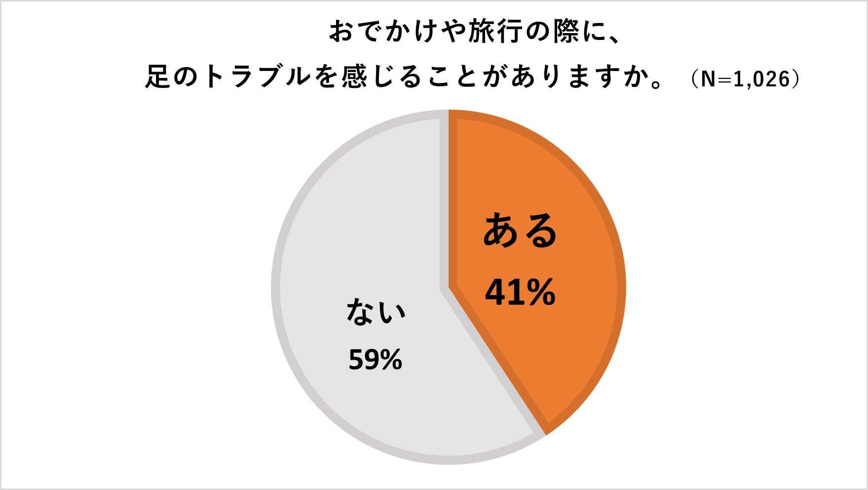 当社が2023年9月に行った「くつに関するアンケート」(有効回答数:1,026)によると、実に41%の方が「おでかけや旅行の際に足のトラブルを感じることがある」と回答しました。