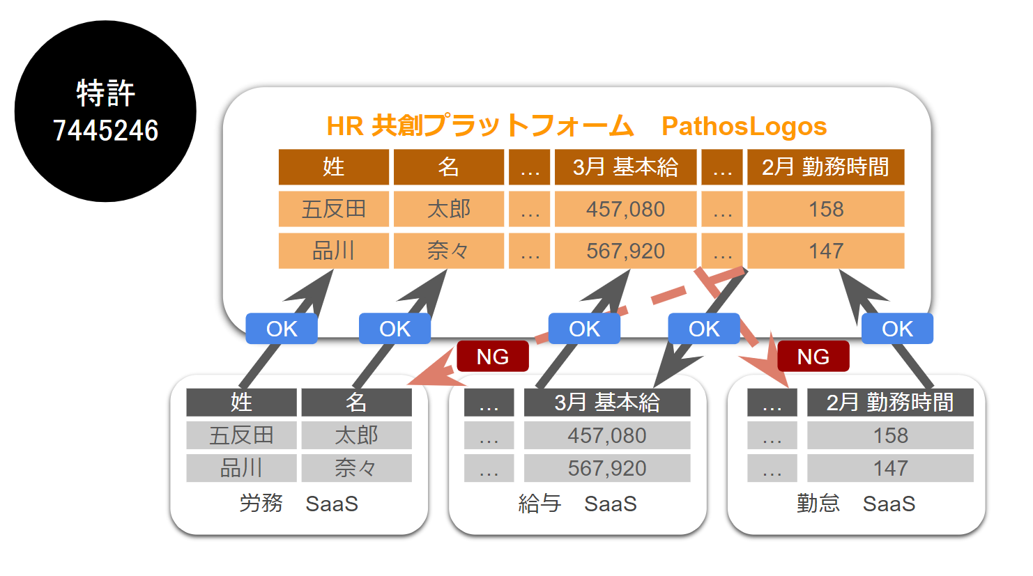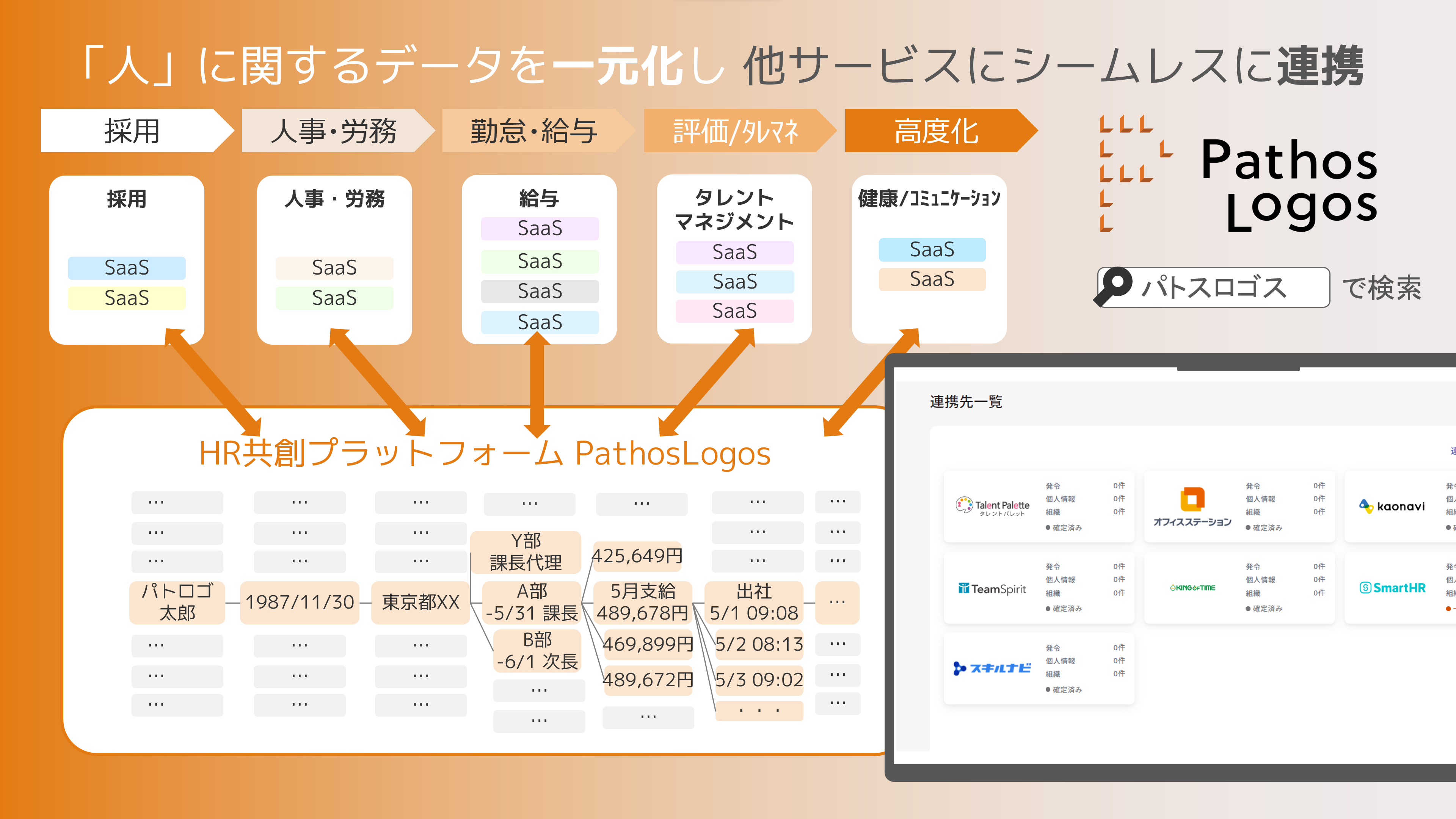 HR共創プラットフォームは、当社の人事に関する豊富な知見に基づいて、「人」に関する様々なデータの項目と、保存の形式を定めております。「PathosLogos」を介して各SaaSがデータ連携を行うことで、