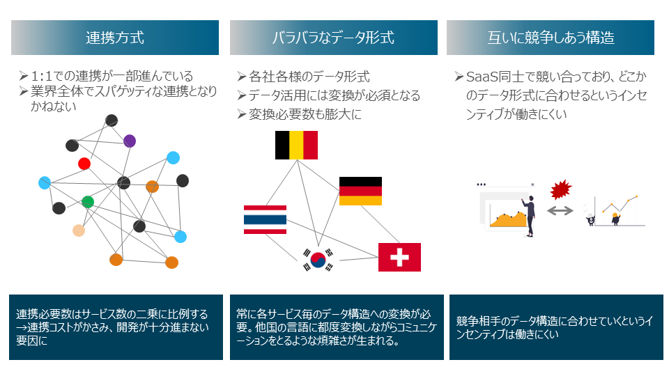 ①それぞれのサービス同士で連携を行っていることから、サービス同士が複雑に絡み合う構造をしており、②それぞれのサービスのデータ保存形式も異なることから、データ連携にも工数がかかり、③これらの課題を解決しようとしても互いに競争しあう構造でありこれまでに解決は図られていませんでした。