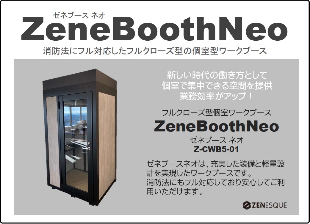 消防法にフル対応したフルクローズ型の個室型ワークブース 「 ZeneBoothNeo( ゼネブースネオ )」 2023年2月より全国発売開始