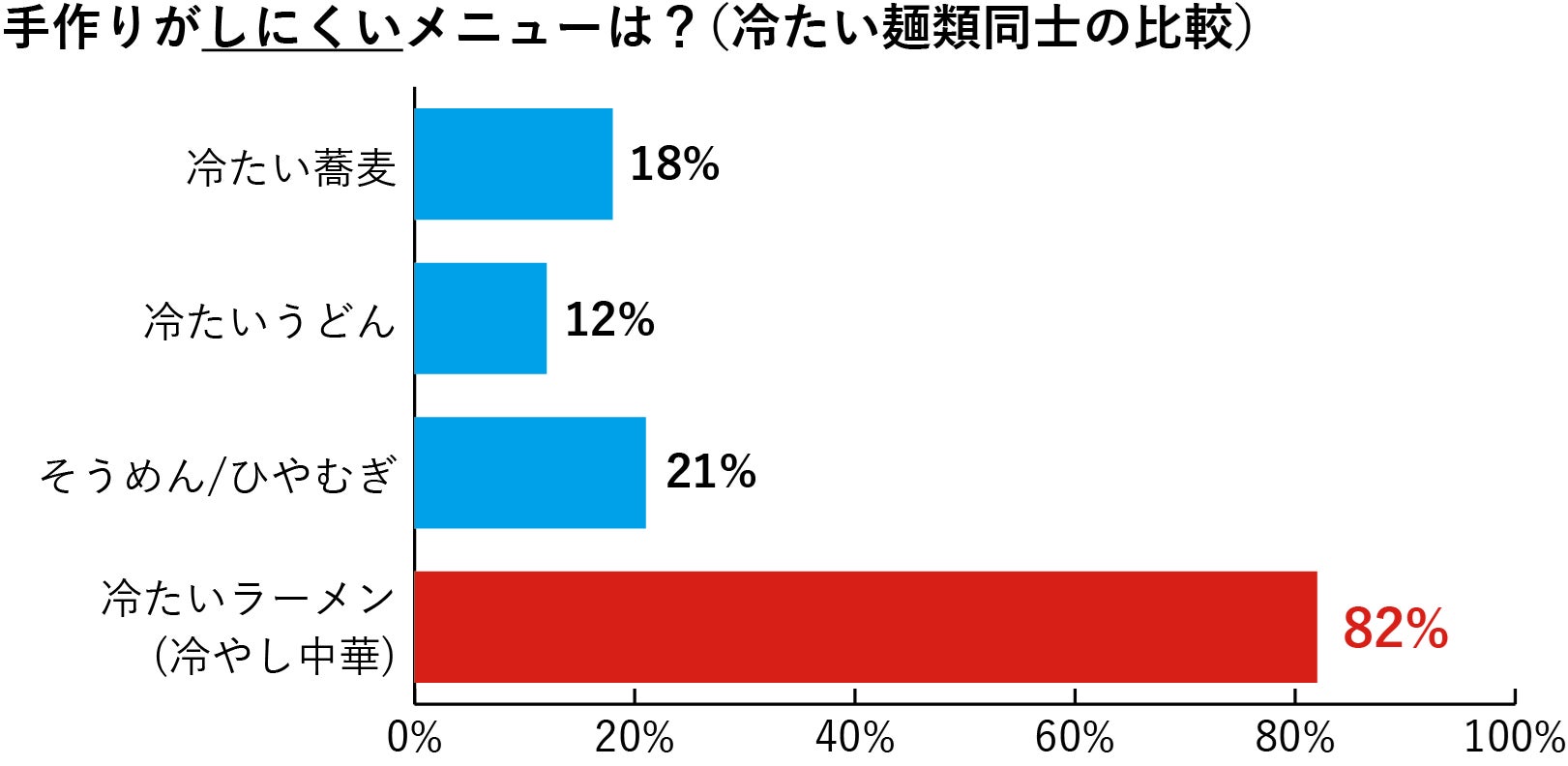 全体の約8割の方が「冷やし中華は手作りが“手間”」という調査結果となりました。その理由としては、自宅で冷やし中華を調理するには、麺を茹でてから冷水でしめるという工程に加え、具となる材料を他の麺メニューより多く用意しなければならない点が“手間”の理由を占めると考えます。