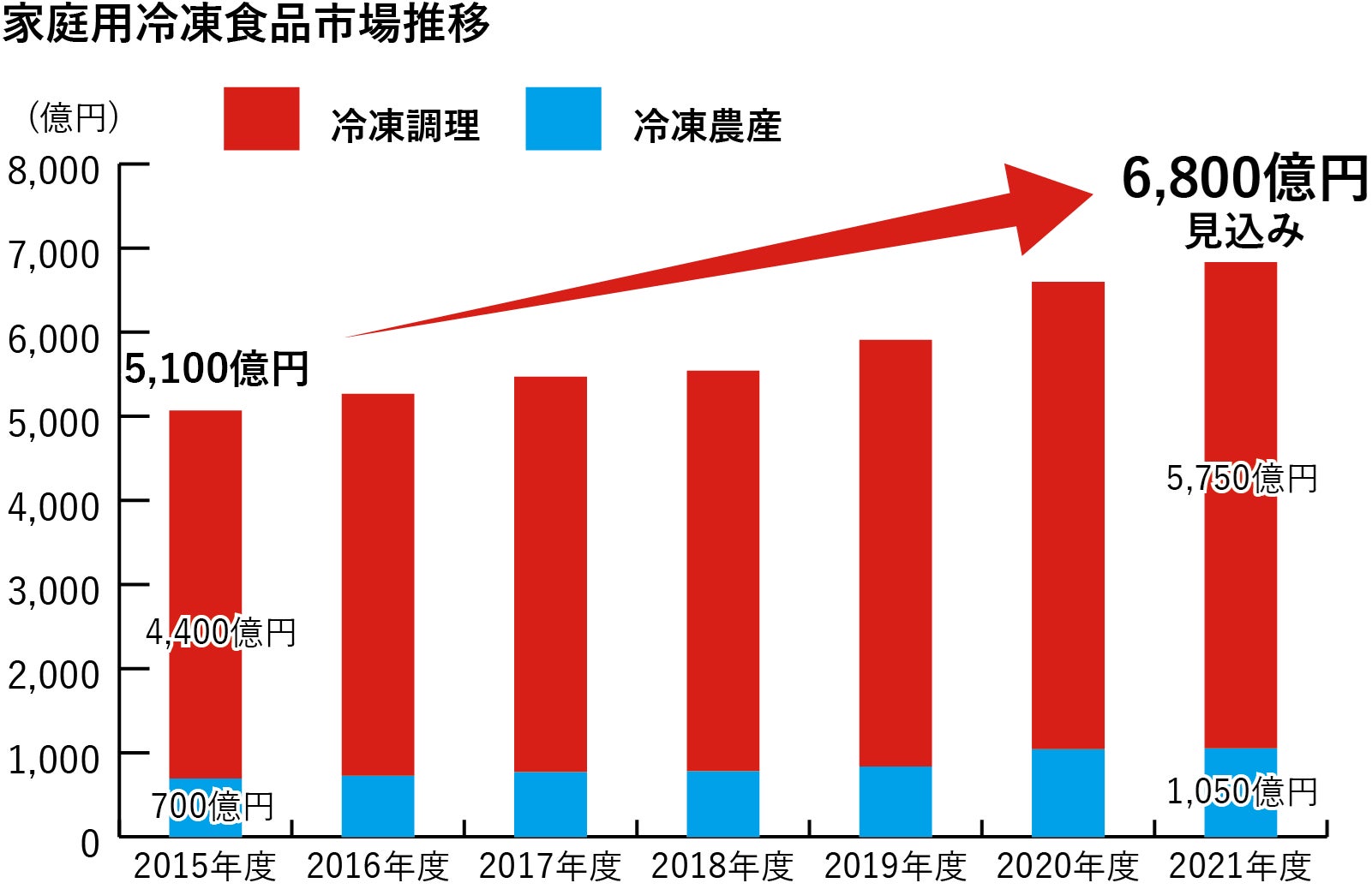 ■家庭用冷凍食品の市場規模拡大2021年度の家庭用冷凍食品市場は、大きく伸長した2020年度を上回り過去最高の6,800億円の規模が見込まれます。(※表1)