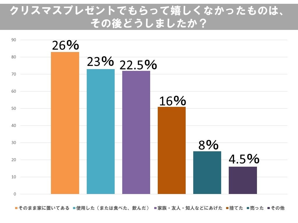 次に、もらって嬉しくなかったクリスマスプレゼントはどうしたのかを調査したところ、最も多かったのは「そのまま家に置いてある」という回答。