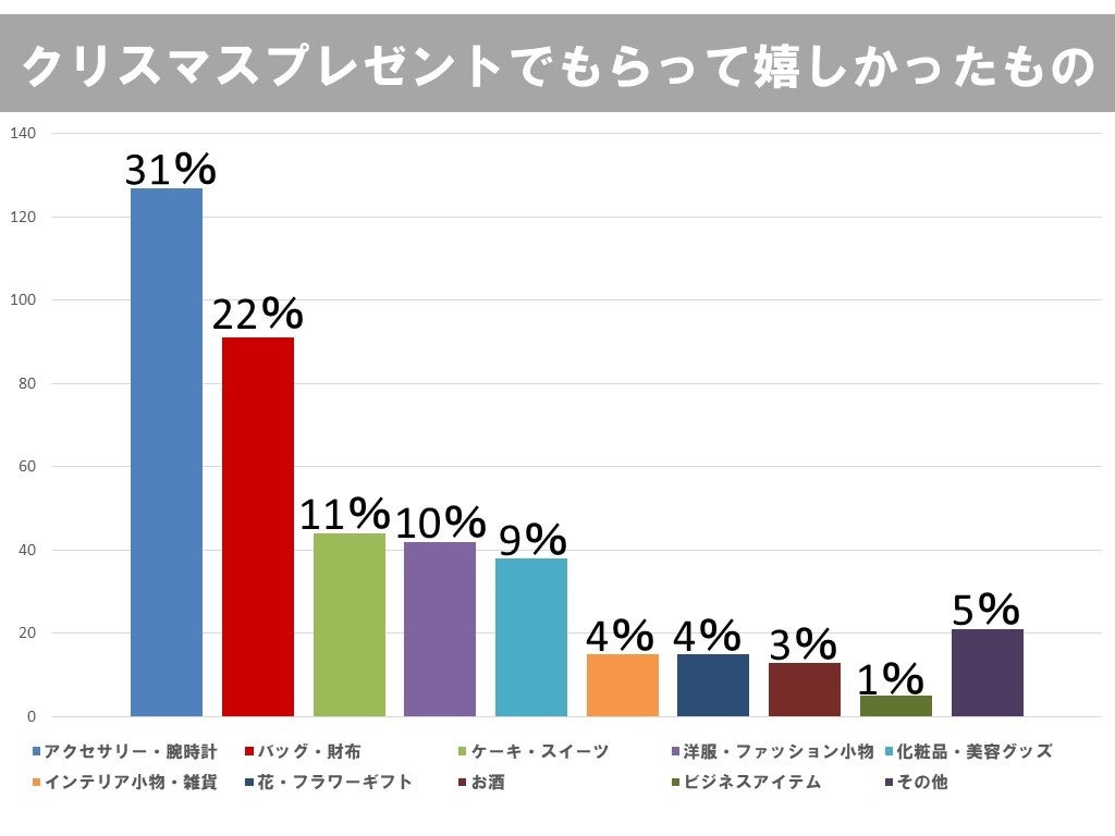 クリスマスプレゼントにもらって嬉しかったものを調査した結果、第1位は「アクセサリー・腕時計」、第2位は「バッグ・財布」でした。