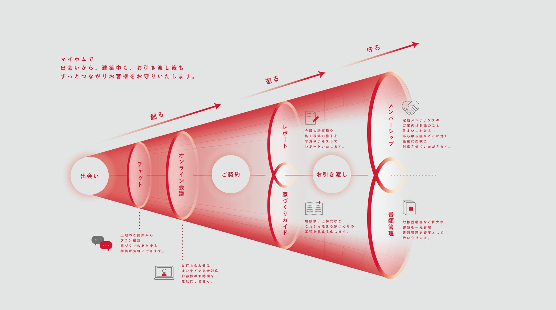 『myhm base』は、ご契約前、着工前、お引き渡しだけでなく、入居後のオーナーさまの住生活までもアプリを活用し、長期的にサポートする特別な家の購入体験の実現を目指していきます。