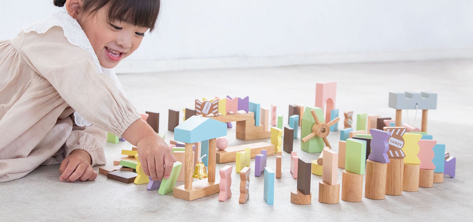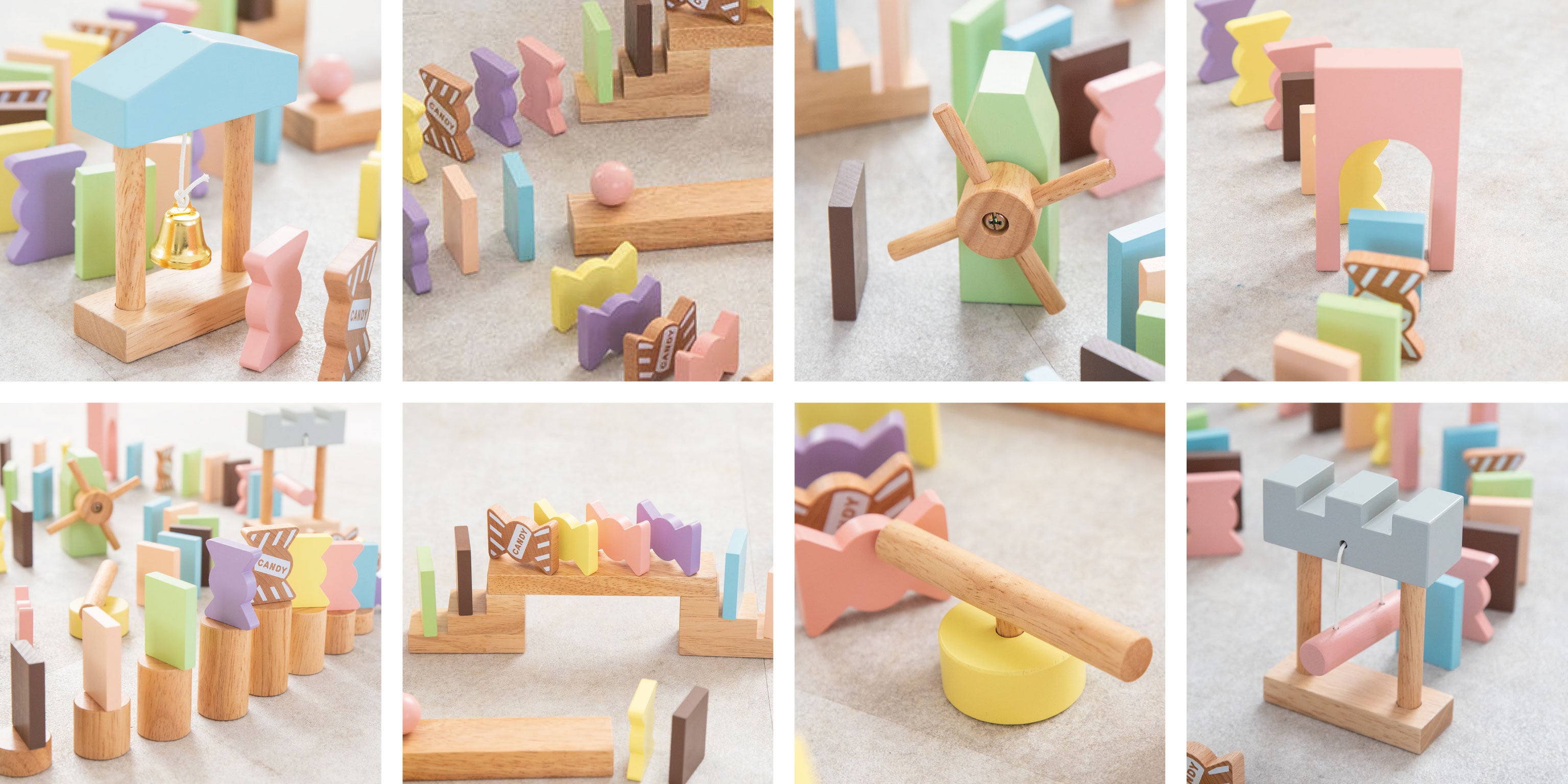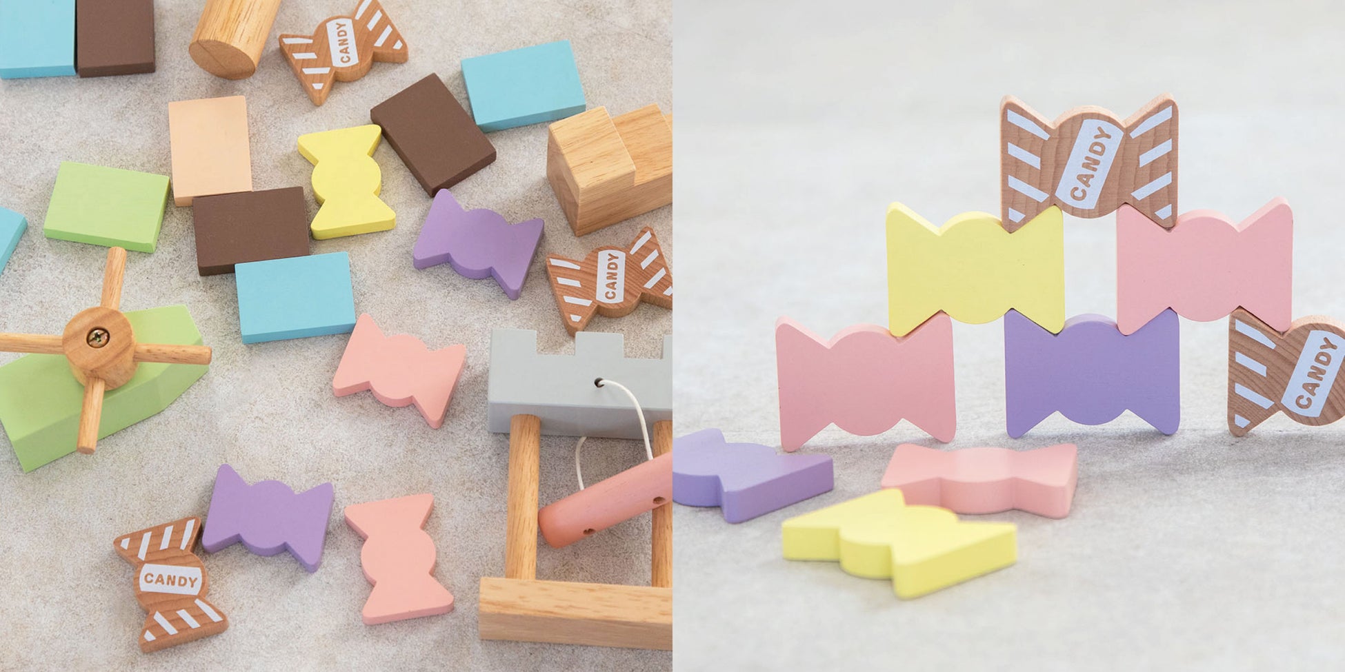 キャンディモチーフのブロックは、ドミノあそび以外にも縦に積んでいくバランスあそびやおままごとなど幅広いあそびを楽しめます。