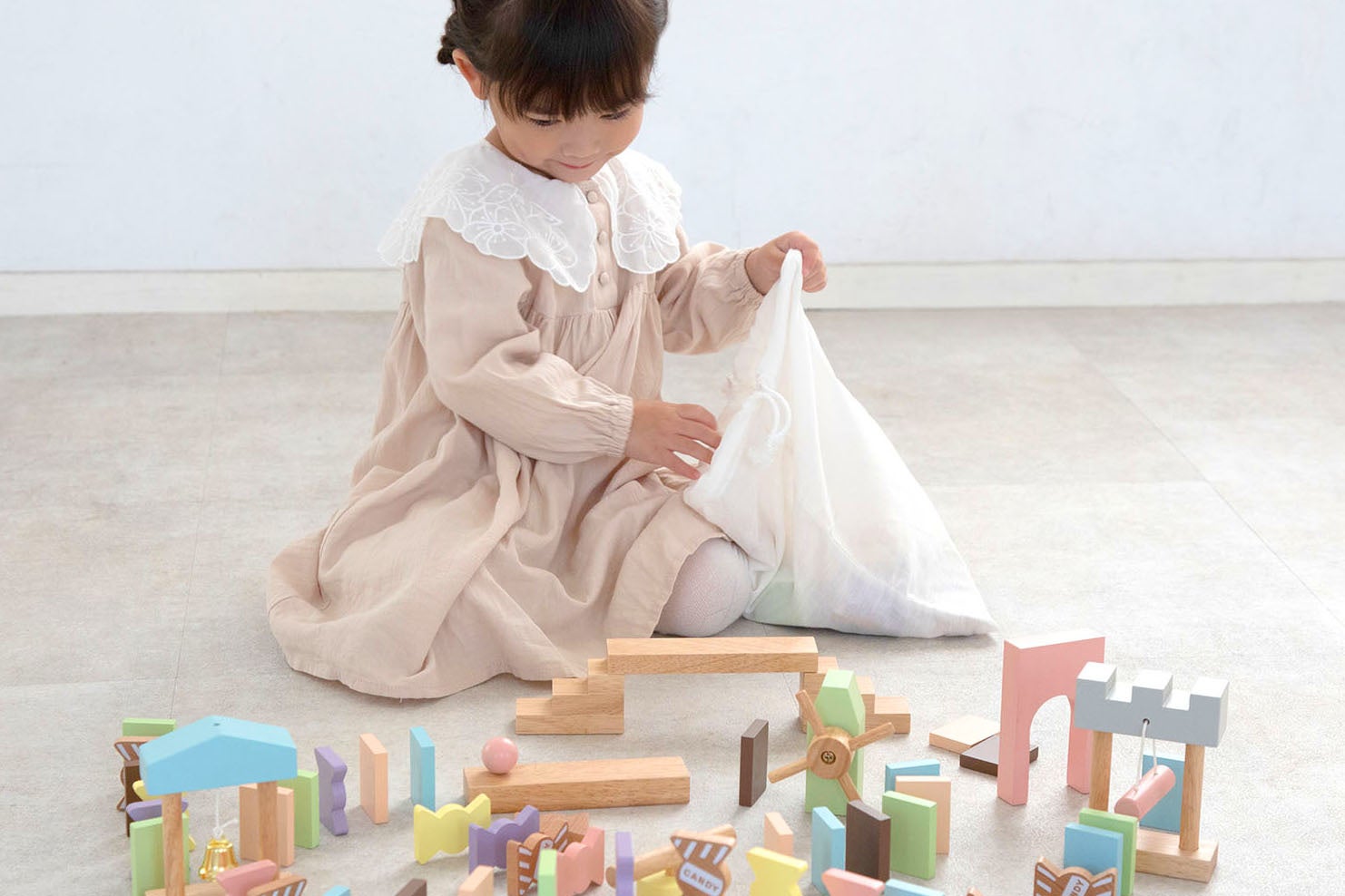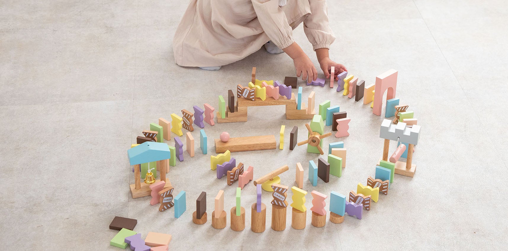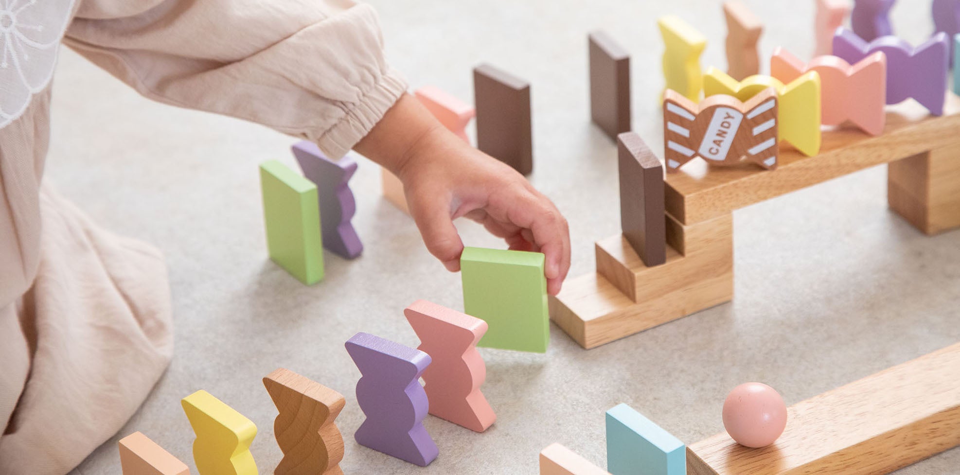 キャンディモチーフのブロックは、ドミノあそび以外にも縦に積んでいくバランスあそびやおままごとなど幅広いあそびを楽しめます。