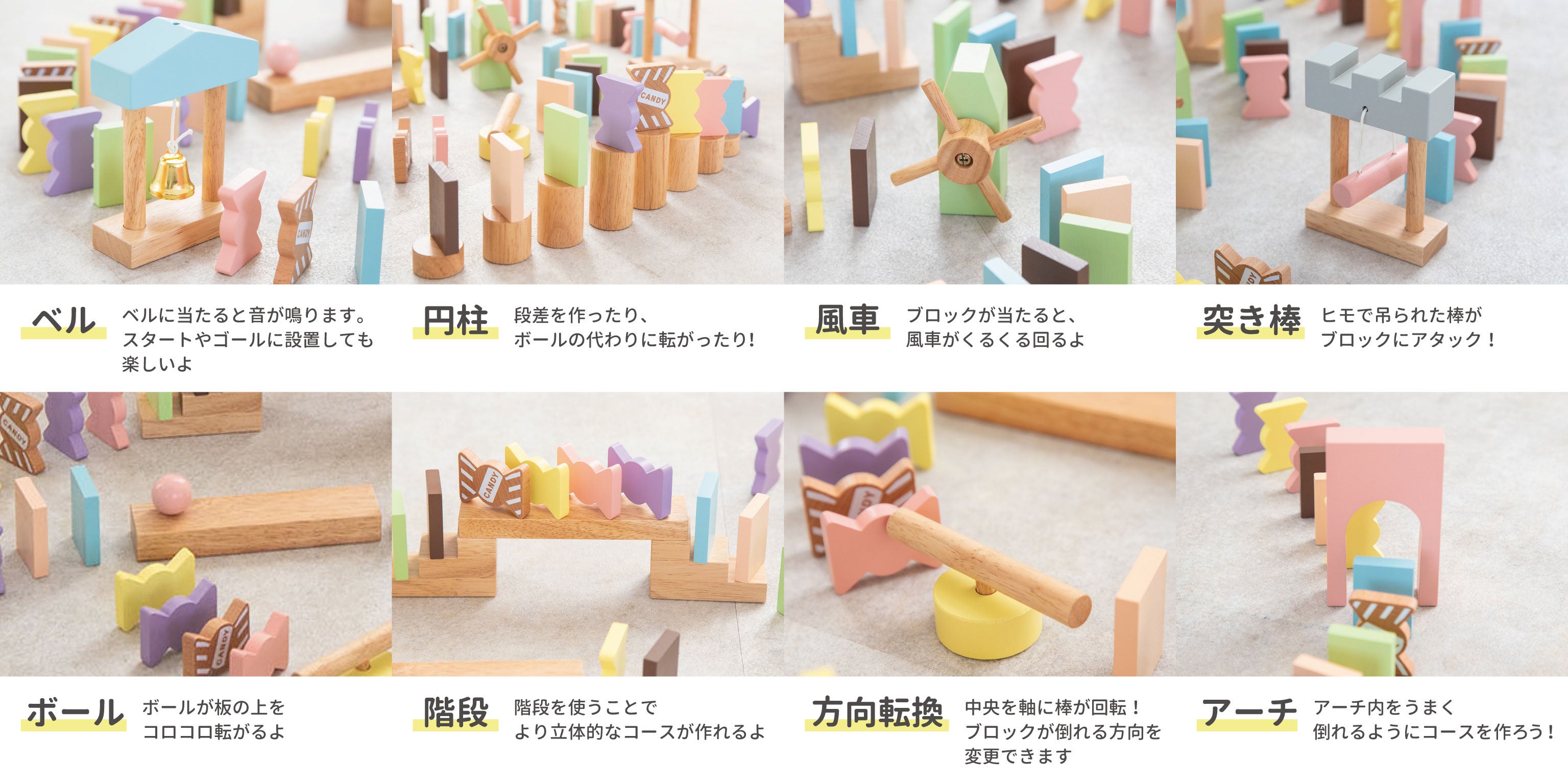 ドミノあそびがさらに楽しくなる8種類のギミックパーツ入り!コースにさまざまな変化をつけられます。