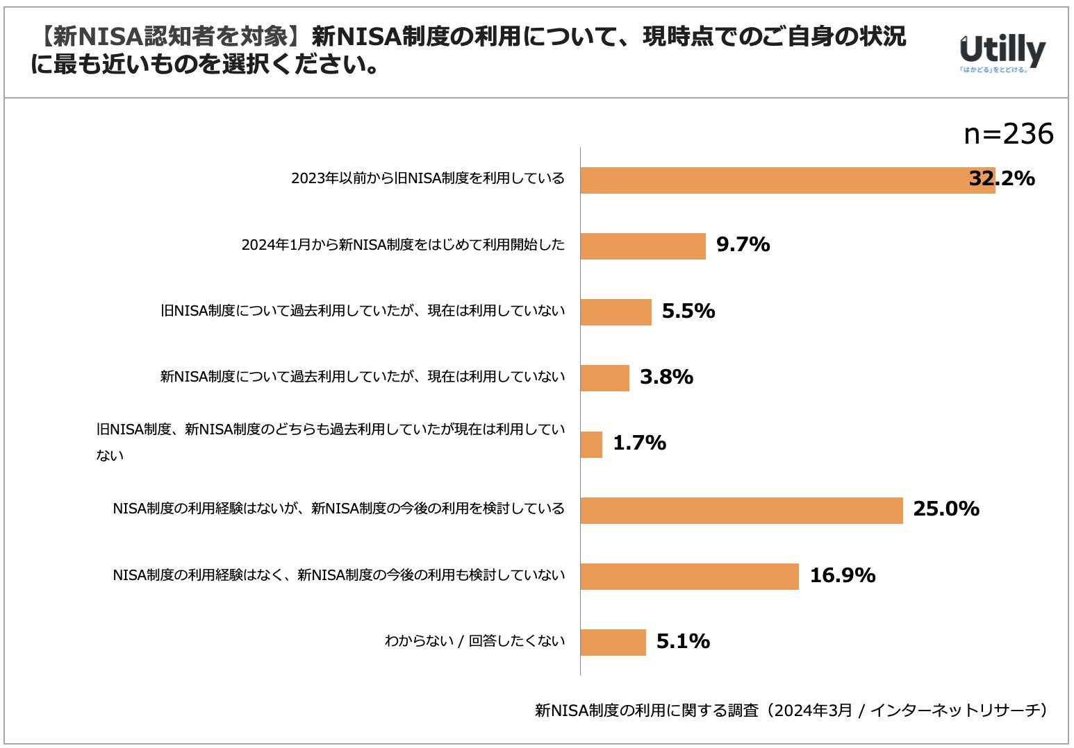 調査対象全体のうち、32.3%がNISA制度を利用中という結果となった。