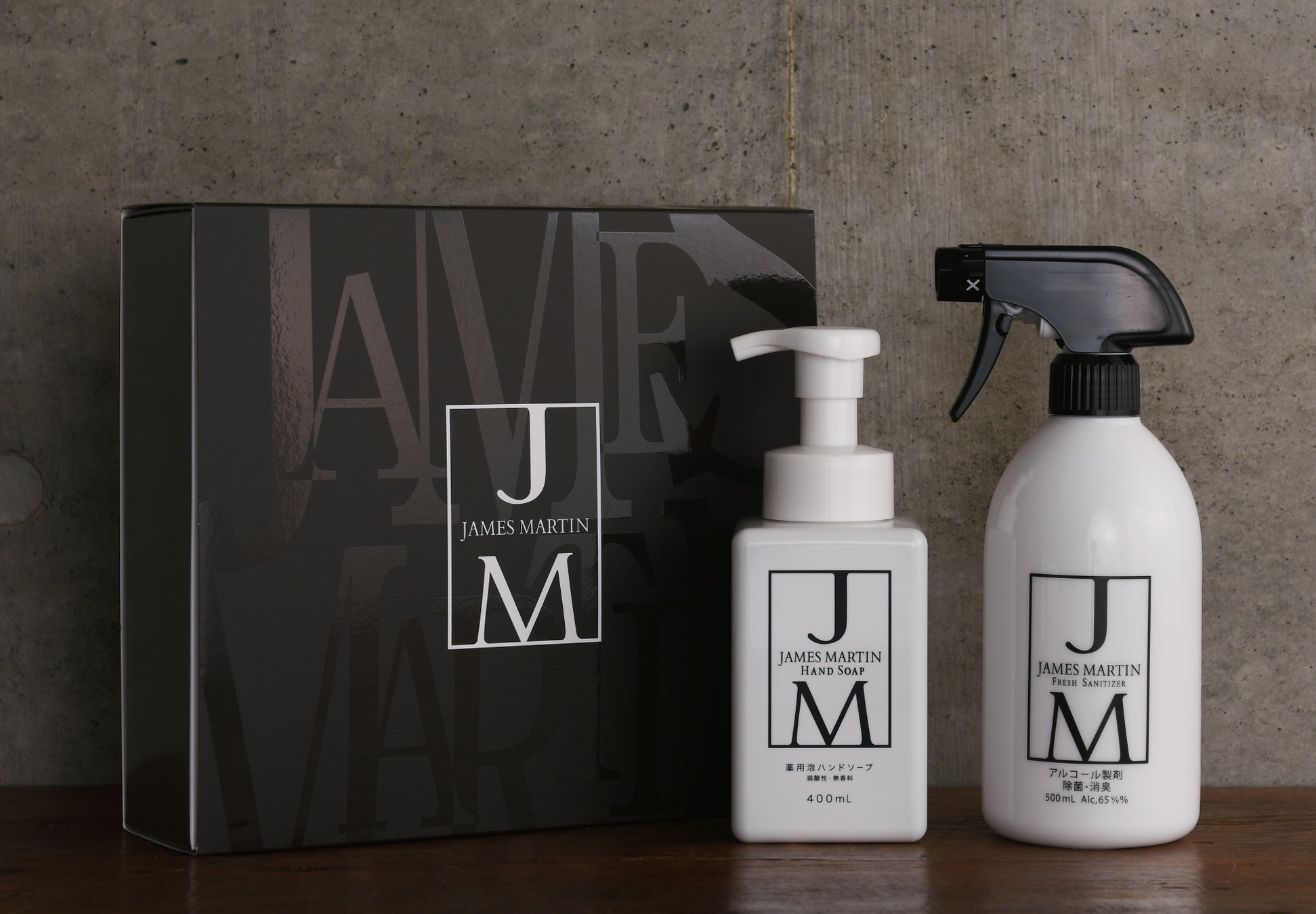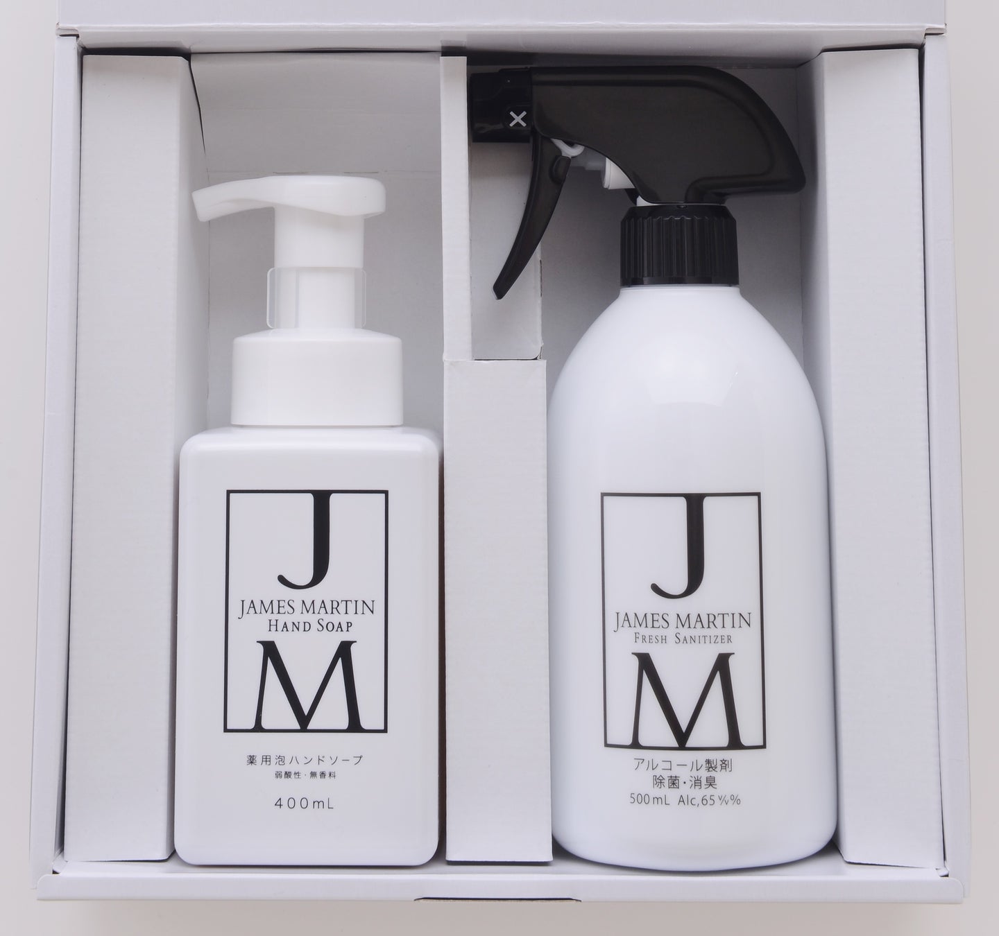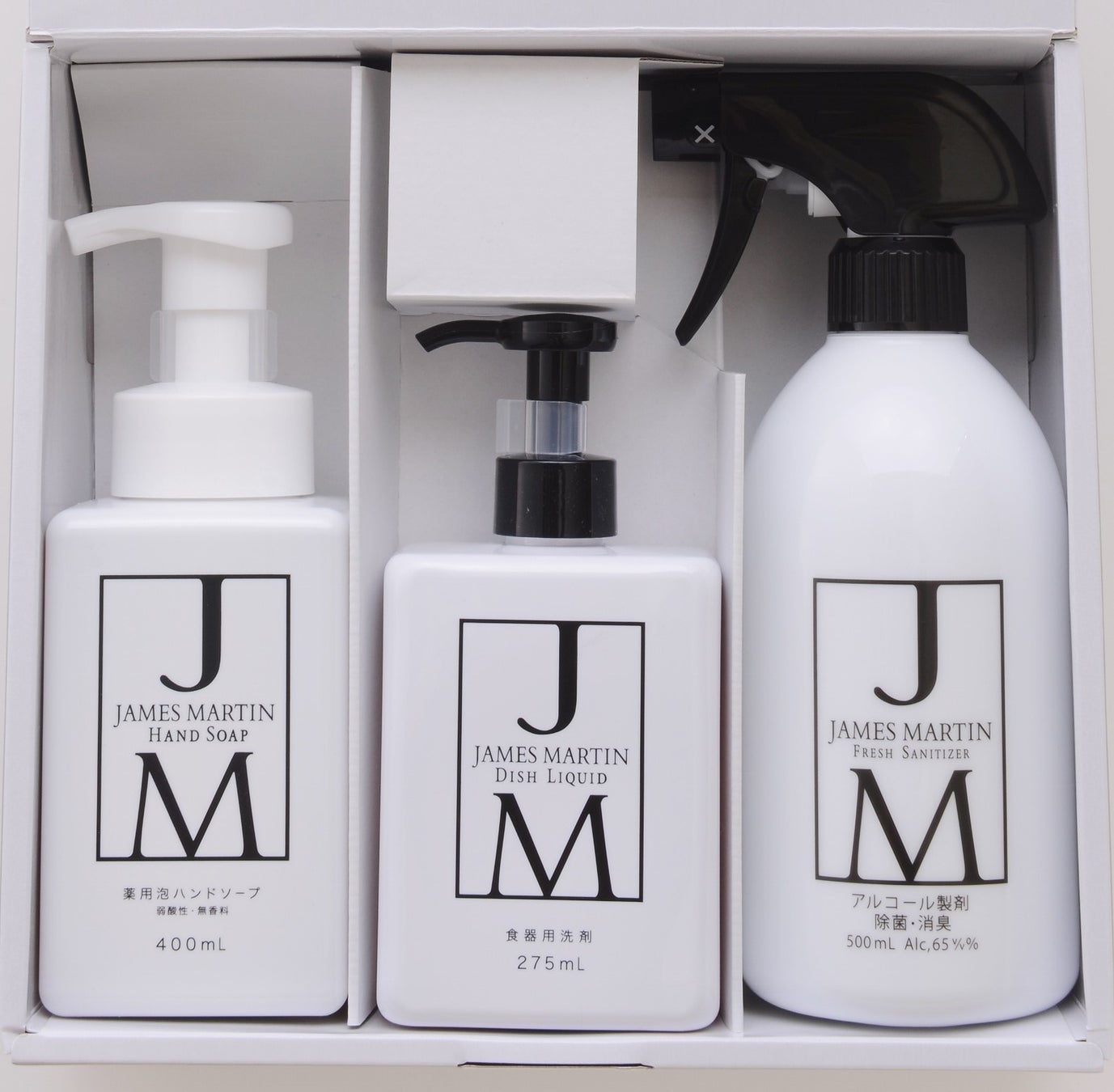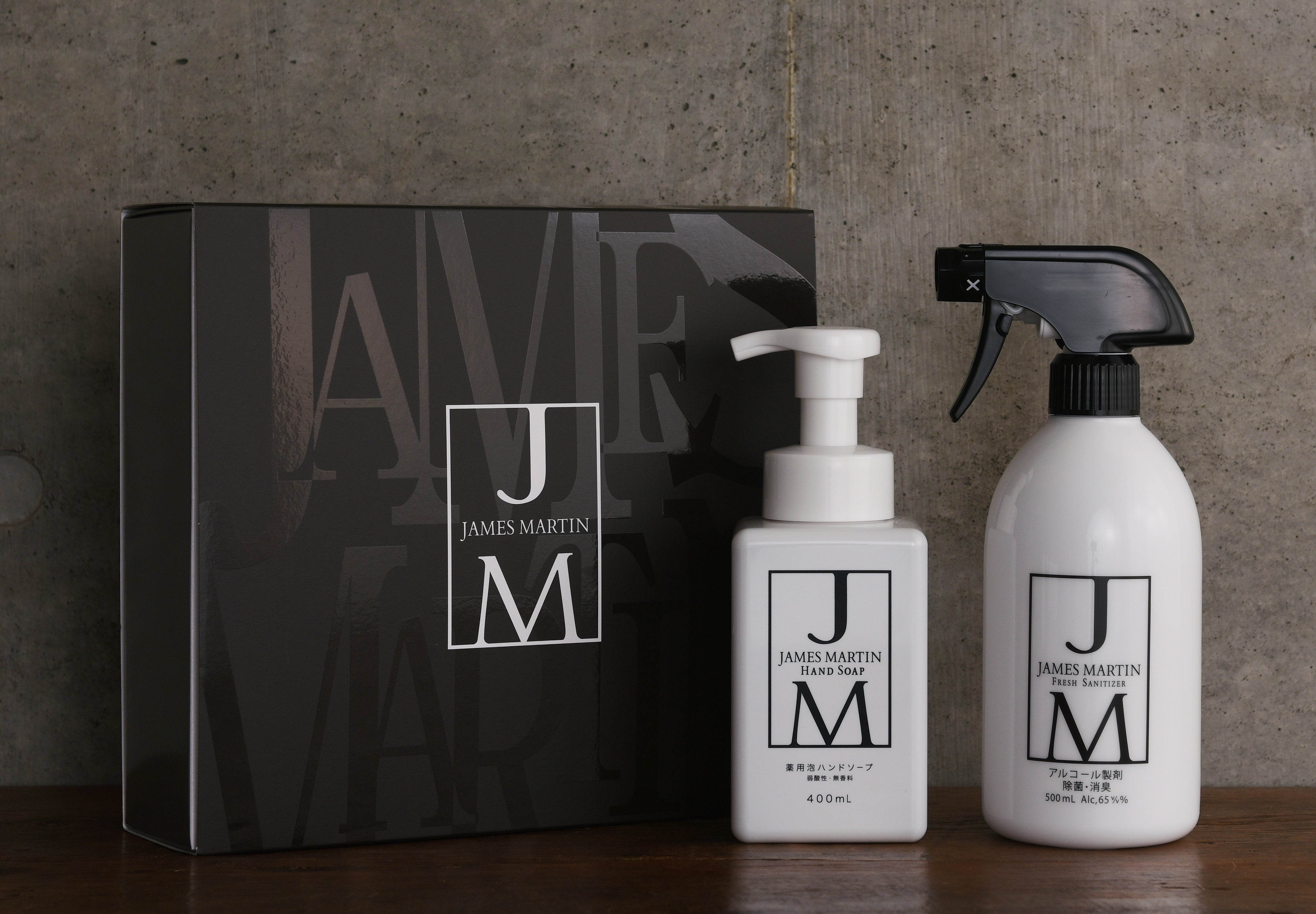 ジェームズマーティン ギフトセットは、新しい生活様式に欠かせない除菌・洗浄アイテムをスタイリッシュなボックスに入れたギフトです。商品を入れるボックスにもこだわり、スリーブ部分は高級感のあるマット加工、その中にある箱は清潔感のある白で作成し、いままでの除菌商品にはなかった贈る方へ感謝の気持ちが伝わる高級感のあるデザインに仕上げました。