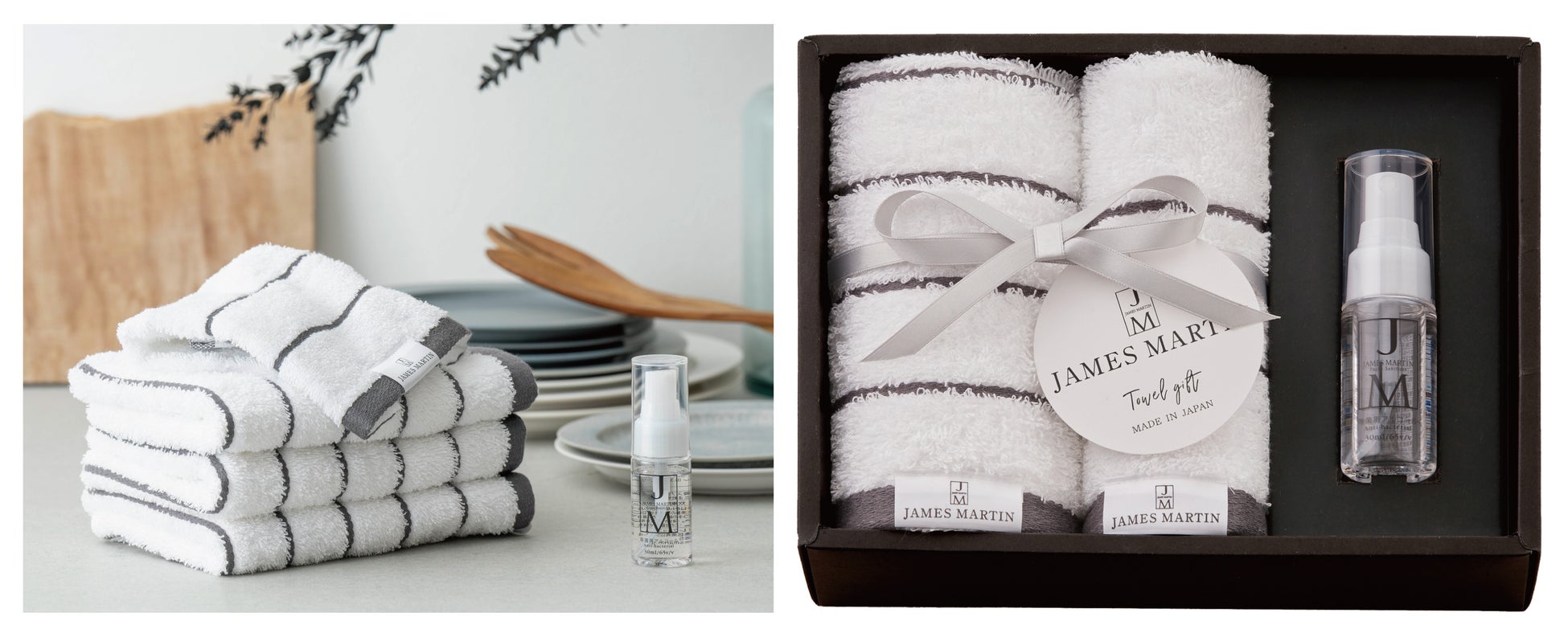毎年好評をいただいているジェームズマーティンですが、今回から新たにスタイレム瀧定大阪株式会社とコラボ商品として企画した「ジェームズマーティン タオルギフトセット」が掲載となりました。「タオルギフトセット」は、抗菌加工を施した柔らかな肌ざわりの泉州タオルと、ジェームズマーティンの食品成分のみで作られた安心安全なアルコール製剤 フレッシュサニタイザーをセットにしたギフトです。お出かけの際に便利なハンドタオルと携帯用フレッシュサニタイザー30ml、日常使いのフェイスタオルの組み合わせをジェームズマーティンのイメージにあったモノトーンの化粧箱に入れたギフトセットなっています。