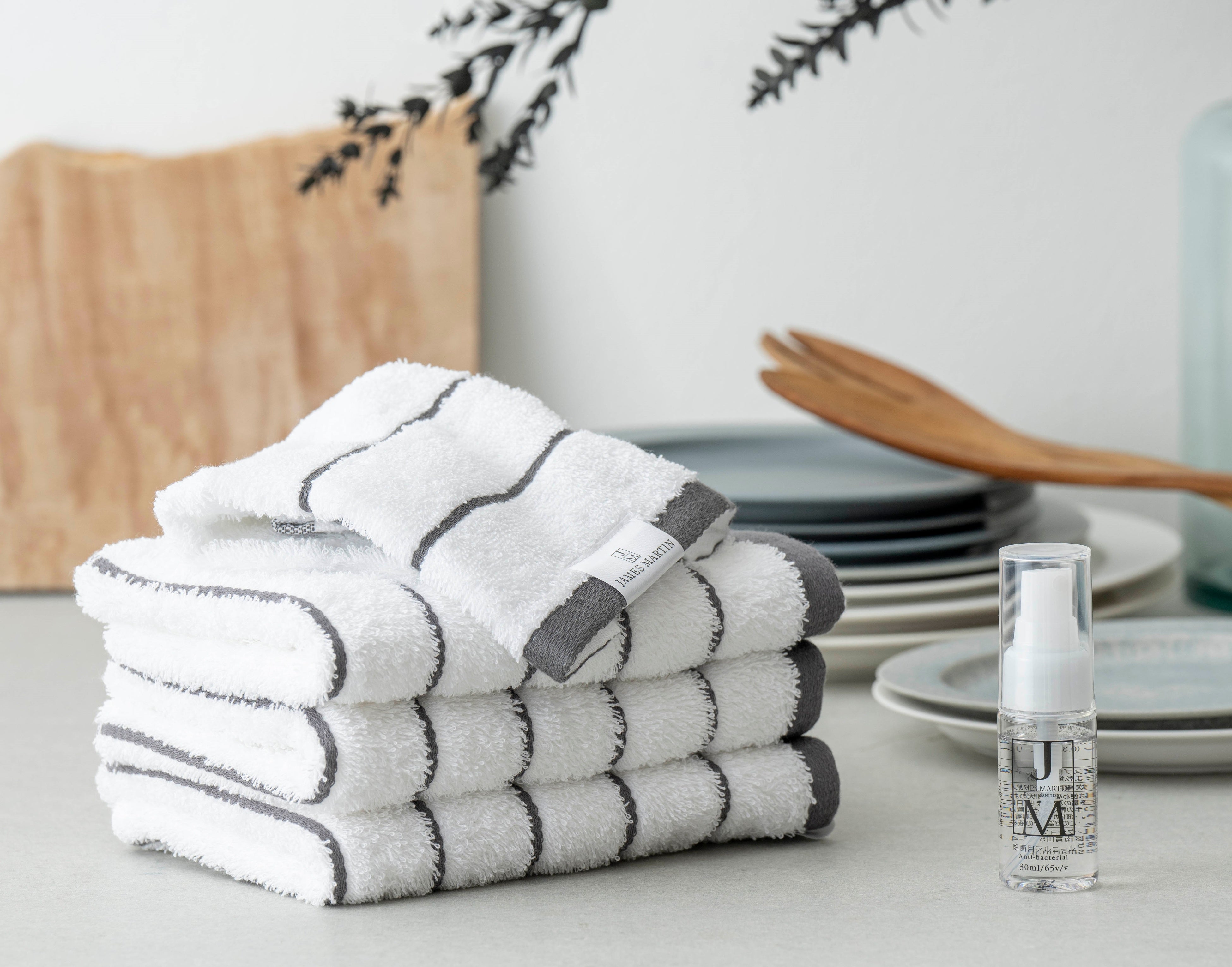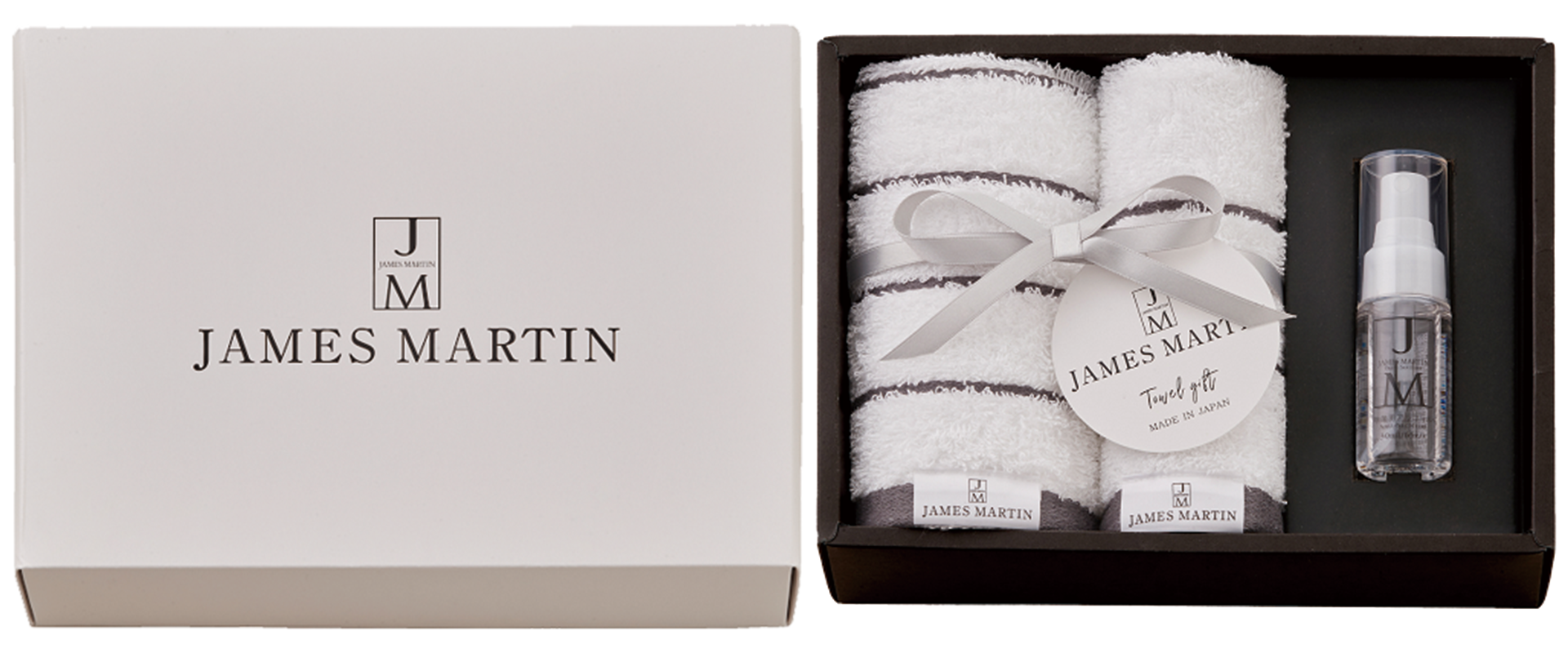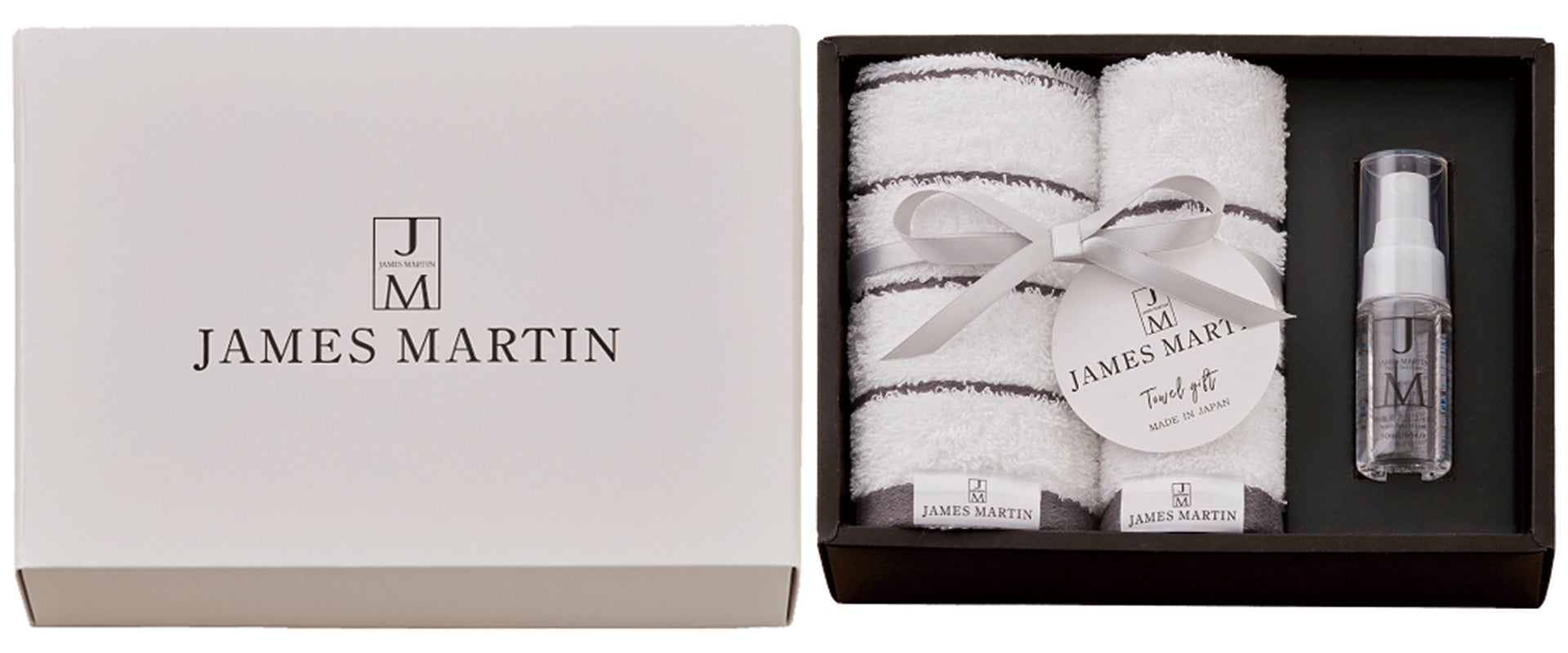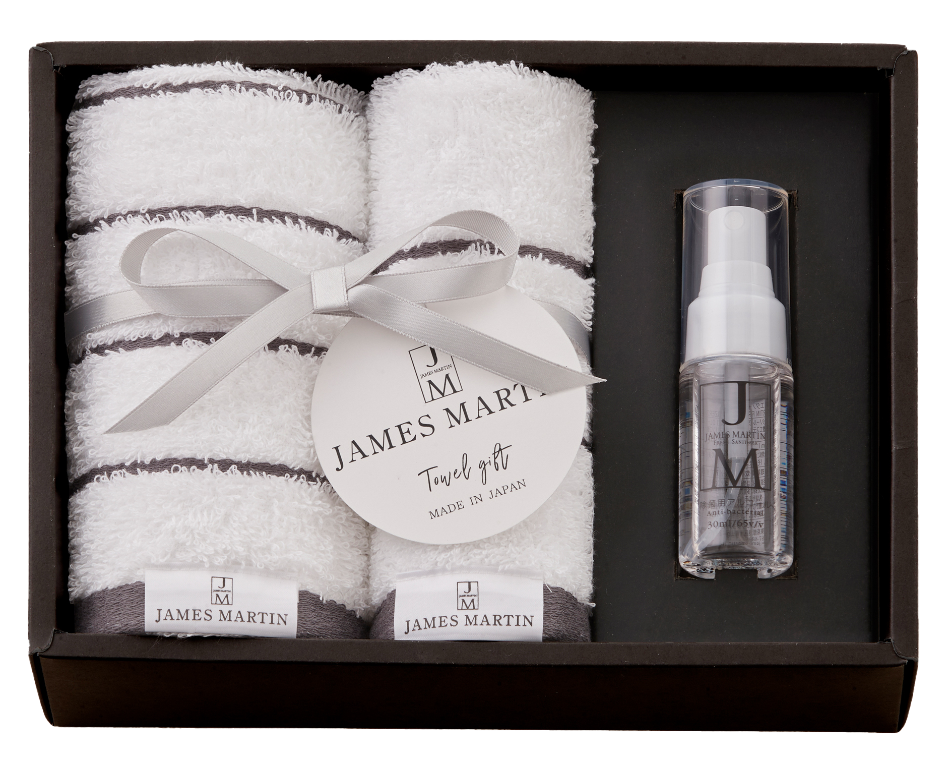 ジェームズマーティン フレッシュサニタイザーと、抗菌加工を施した柔らかな肌ざわりの泉州タオルをモノトーンのスタイリッシュなボックスにセットしたどなたにも贈りやすい日本製のギフトです。
