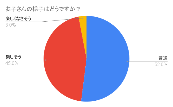 お子さんの様子は大部分が普通であり、楽しさを感じている子も多いようです。楽しくなさそうという回答は、一部にとどまりました。