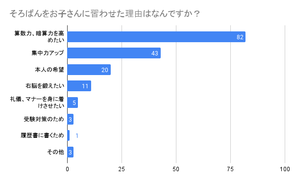 全体的に、そろばんを習わせる理由や効果に関する意識が高く、個々の子供の成長や学習のサポートを重視していることが伺えます。そろばんは計算力や集中力の向上に役立つ教材として、幅広い年齢層の子供たちに選ばれていると言えるでしょう。