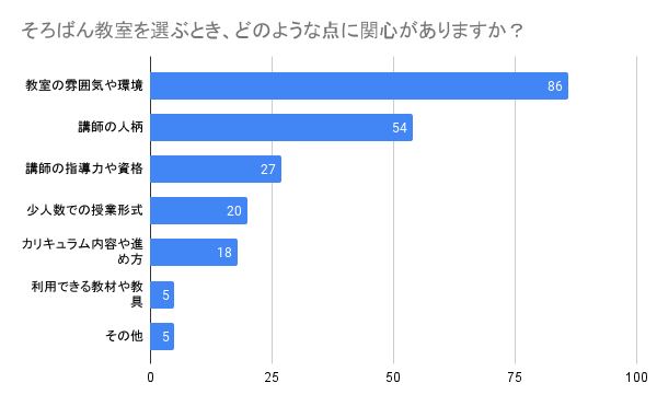 教室選びでは、教室の雰囲気や環境、講師の人柄が重視されており、子供たちが快適な学習環境であることや、講師との良好な関係が求められていることが分かりました。