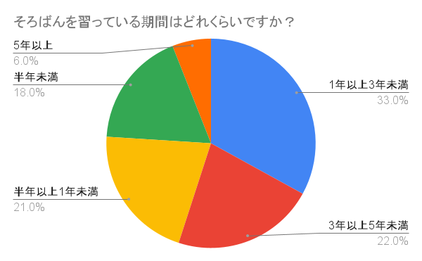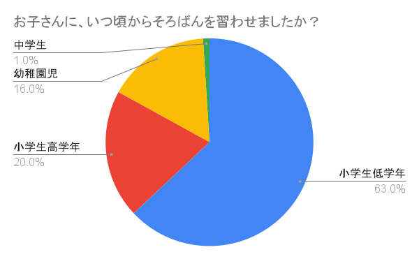お子さんにそろばんを習わせた時期は以下のように分かれました。小学生低学年(1~3年生)の63人、小学生高学年(4~6年生)の20人、幼稚園児の16人、そして中学生の1人です。