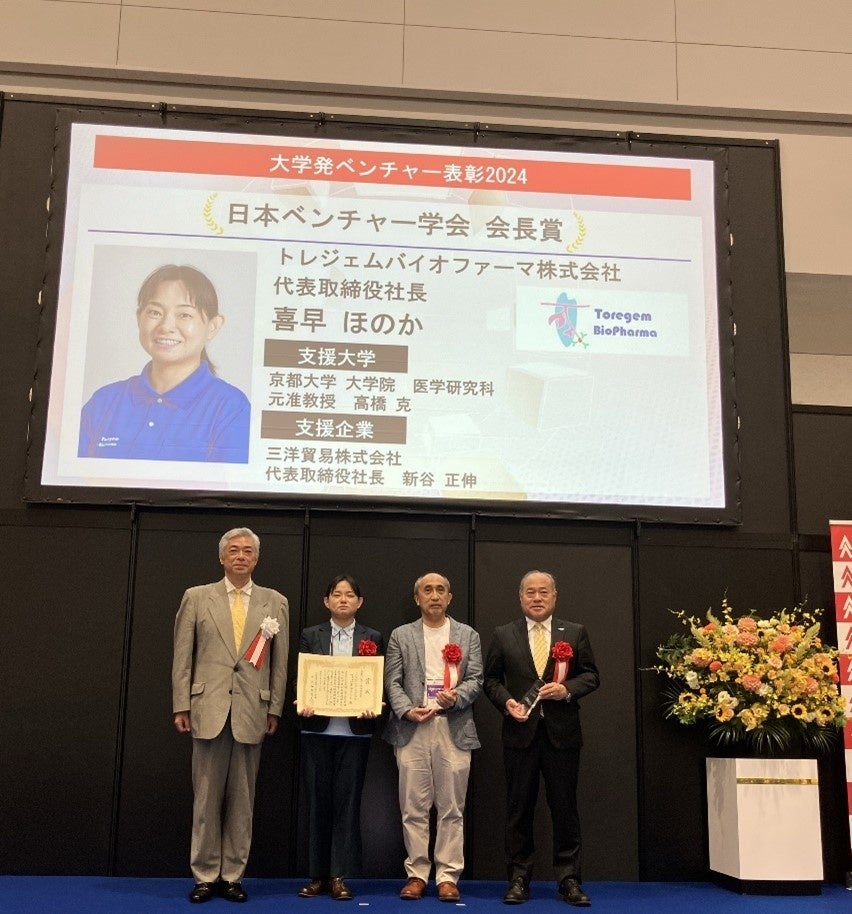 三洋貿易株式会社(本社:東京都千代田区、代表取締役社長:新谷正伸、以下「三洋貿易」)の出資先であるトレジェムバイオファーマ株式会社(本社:京都市上京区、代表取締役:喜早ほのか、以下「トレジェムバイオファーマ」)が、国立研究開発法人科学技術振興機構(JST)と国立研究開発法人新エネルギー・産業技術総合開発機構(NEDO)の主催する"大学発ベンチャー表彰 ~Award for Academic Startups~"において、日本ベンチャー学会会長賞を受賞しました。同時に、三洋貿易も特にその成長に寄与した支援企業として表彰を受けました。