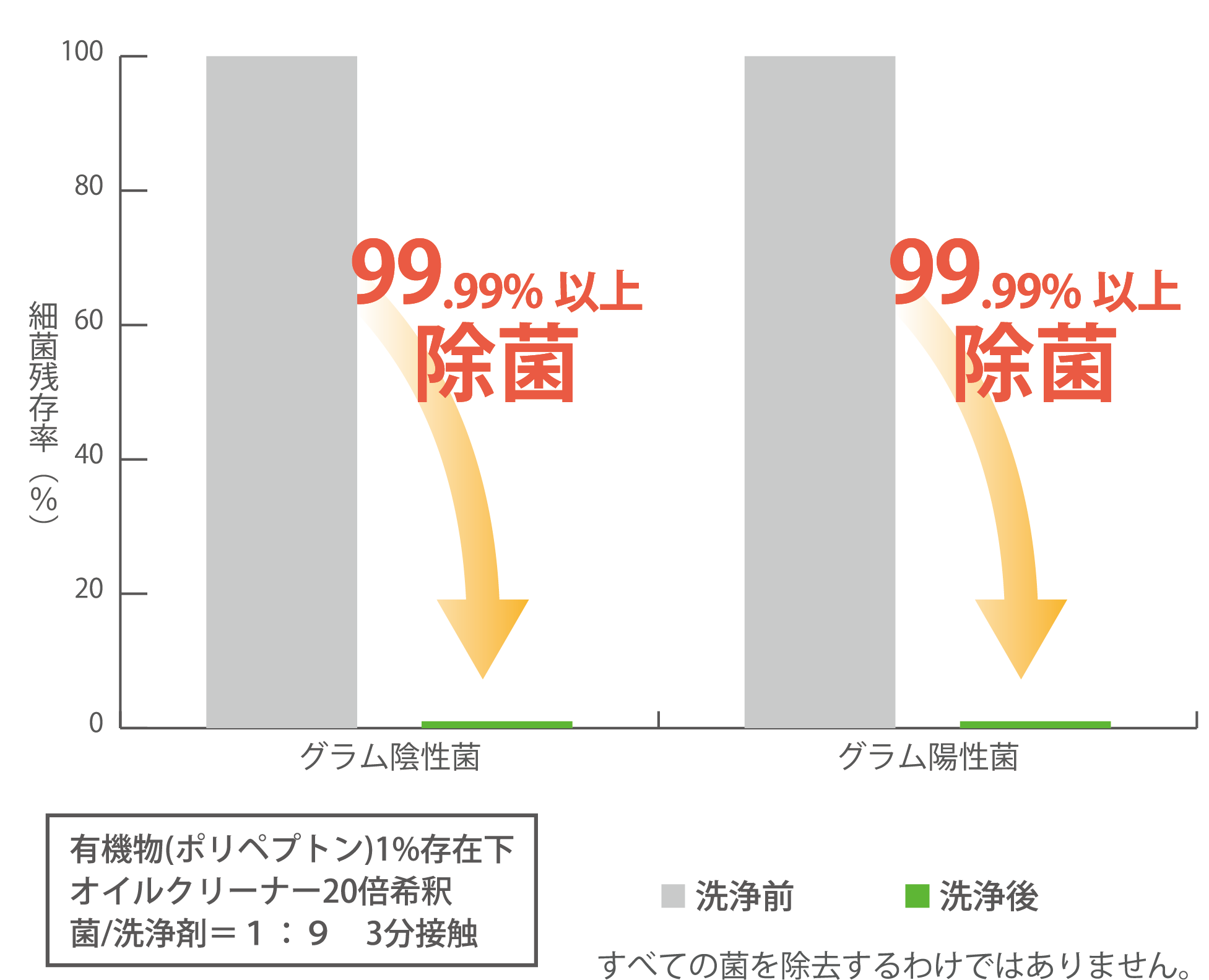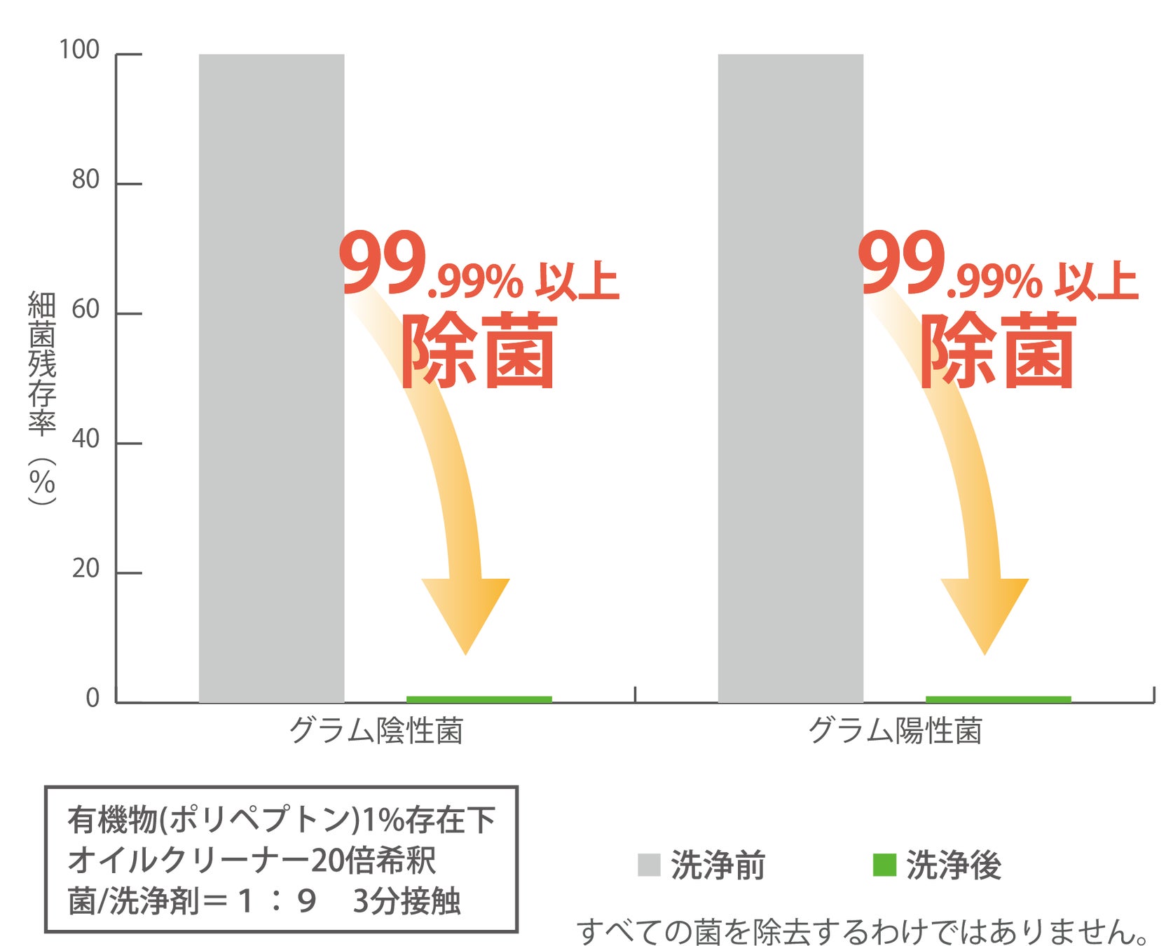 有機物存在下でも除菌効果を確認。洗浄と除菌がこれ1本で行えます。
