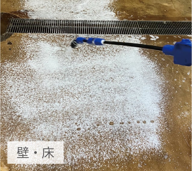 また、専用の発泡洗浄機を使用することで、密着した泡により、こすらず簡単に広範囲を洗浄でき、床や壁などの垂直面にもご使用いただけます。