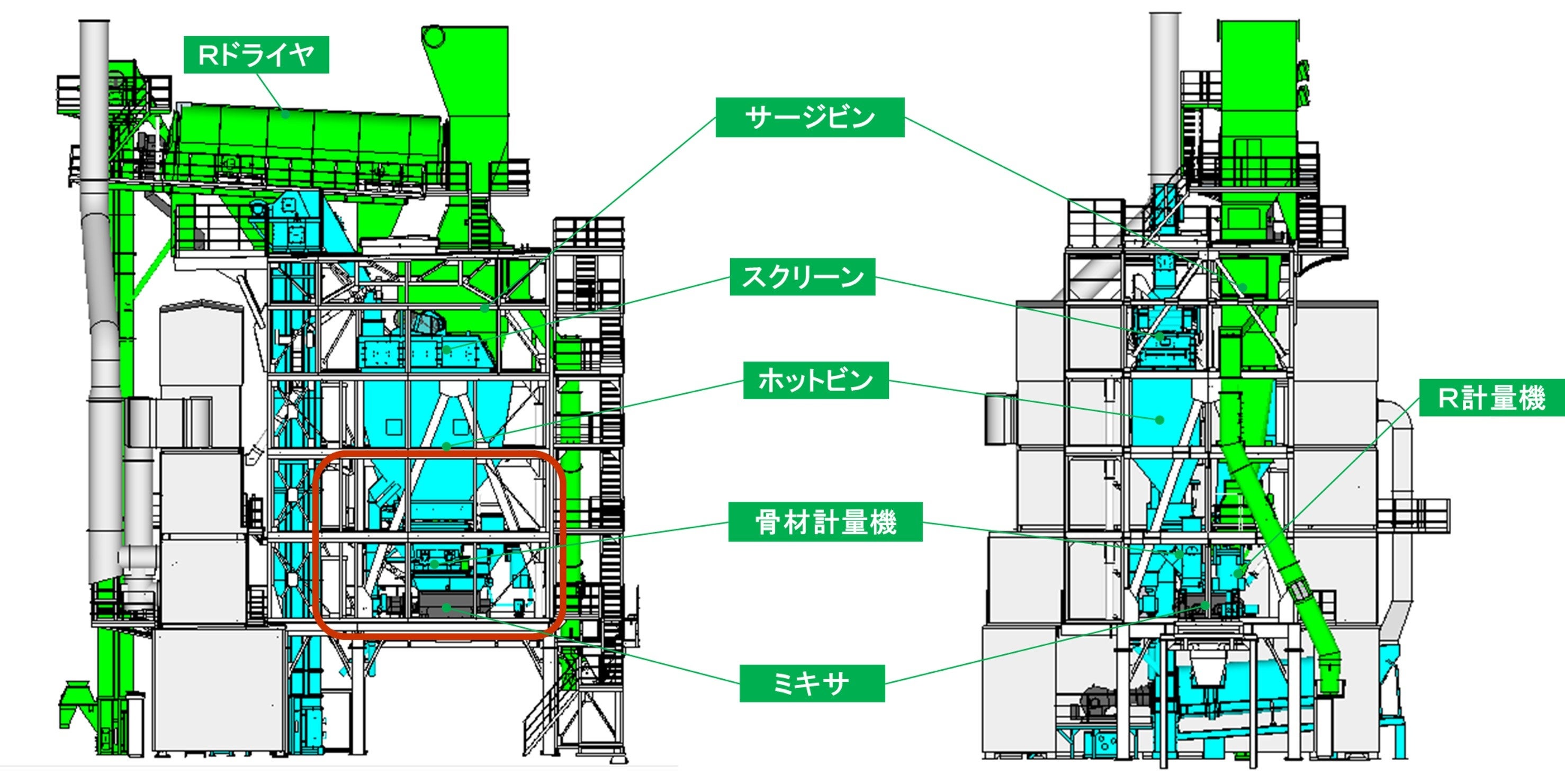 これにより、従来機種と比べてプラント組立期間を2週間以上短縮する事ができ、安定的なアスファルト合材の供給に貢献しました。