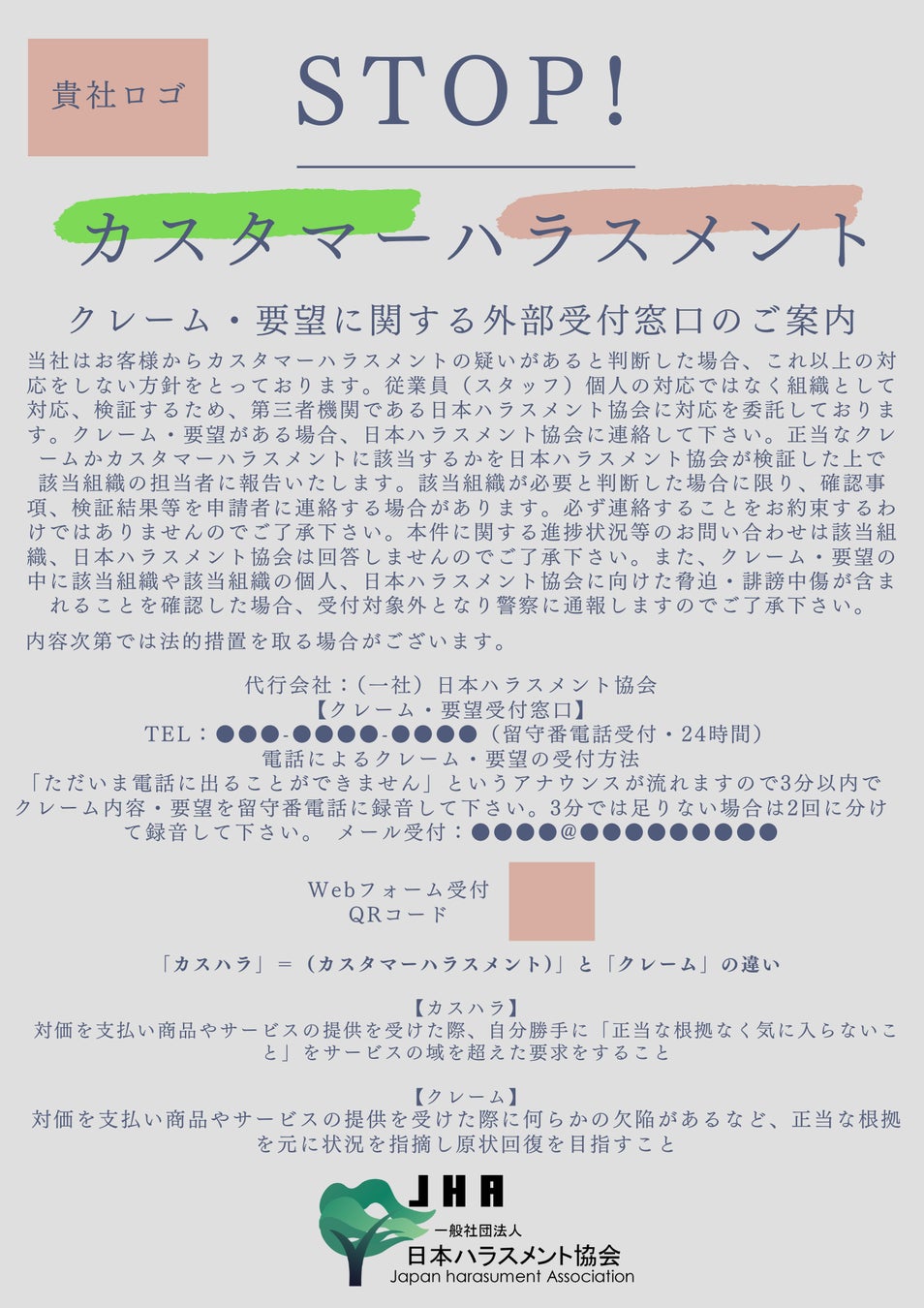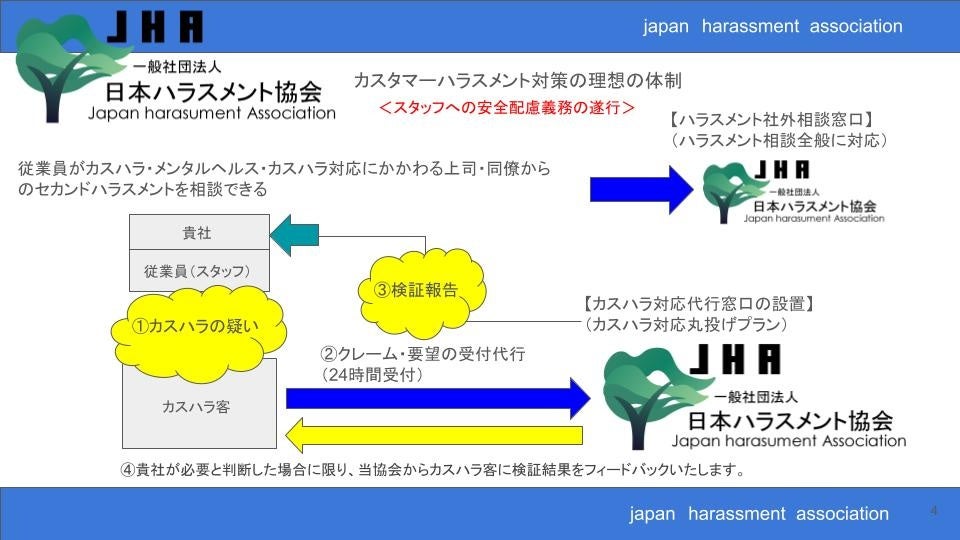 ハラスメント専門家として企業のハラスメント対策を支援する一般社団法人日本ハラスメント協会(本部事務局:大阪市西区、代表理事:村嵜要)は、企業や自治体がカスハラに組織対応できる、カスハラ(カスタマーハラスメント)対応代行窓口サービスを開始いたします。