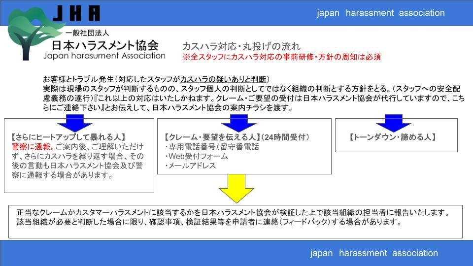 ●従業員(スタッフ)個人の判断(対応)ではなく組織としてカスタマーハラスメントに対応するため、一定の疑いが生じた場合、日本ハラスメント協会に対応をバトンタッチする(丸投げ)