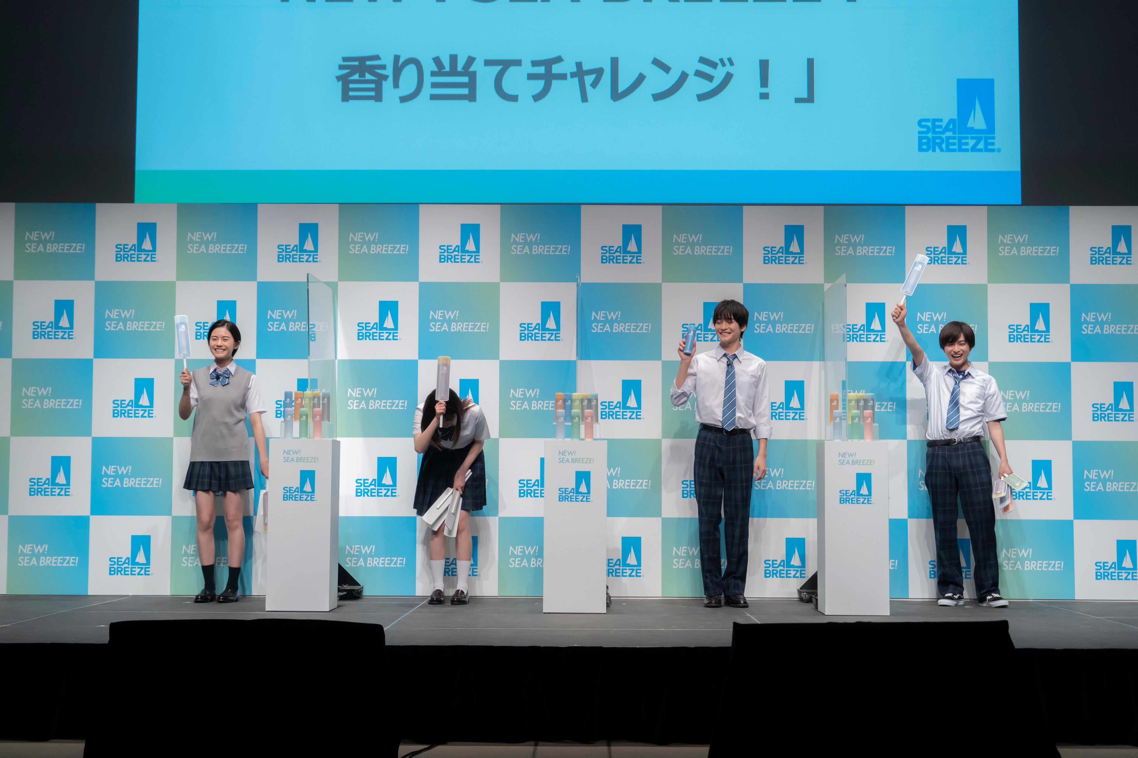 その後、特別ゲストとして、新WEB CMに登場する4名のゲスト、高橋 文哉(たかはし ふみや)さん、曽田 陵介(そた りょうすけ)さん、福山 絢水(ふくやま あやみ)さん、安斉 星来(あんざい せいら)さんにご登壇いただき、CM撮影時のエピソードや、新学期・新生活にちなんだ「この春に向けて新しく挑戦したい」エピソードについて語っていただきました。さらに生まれ変わったシーブリーズの香りを当てる「爽やかな香りを当てろ!NEW! SEABREEZE! 香り当てチャレンジ!」を実施しました。