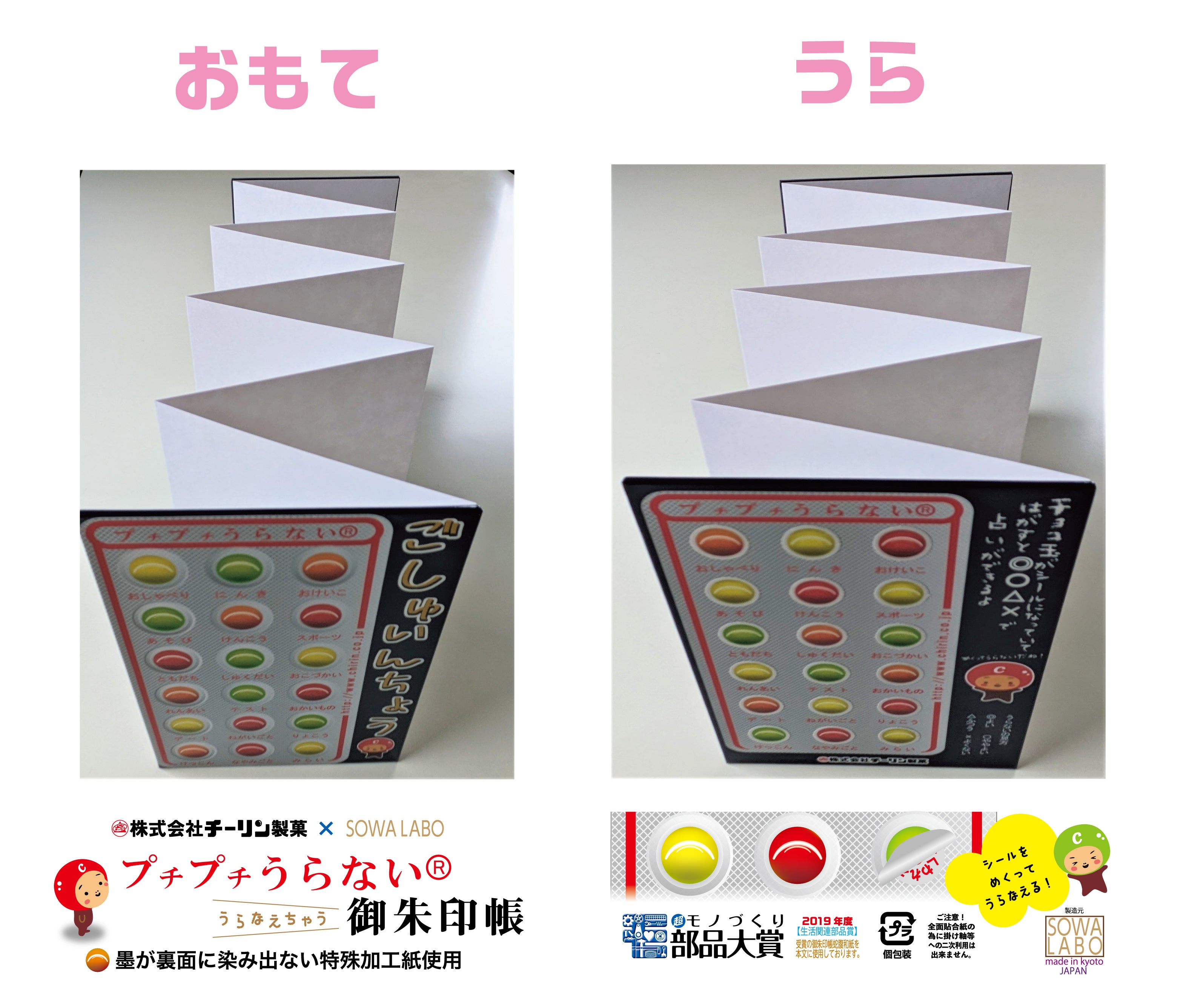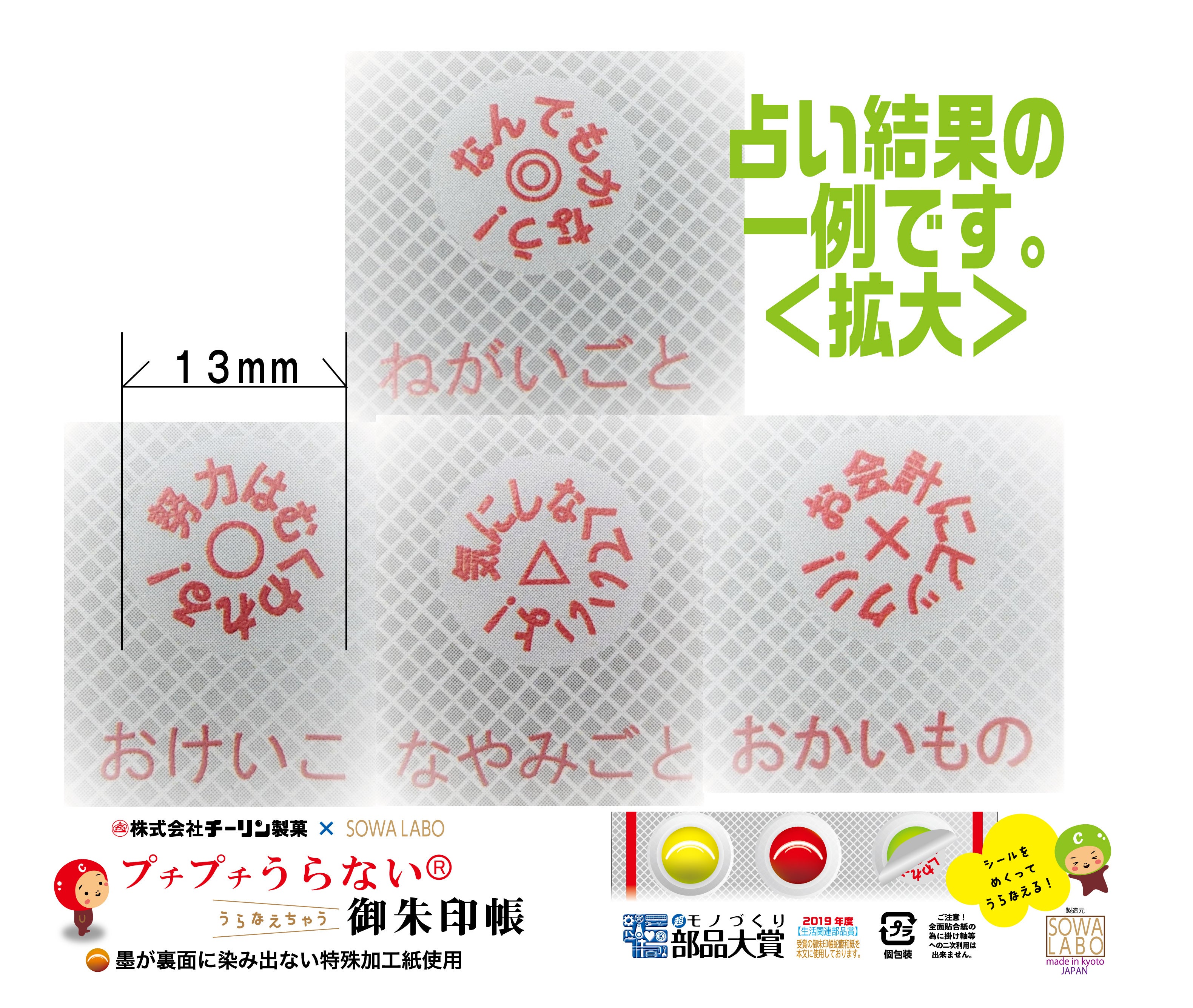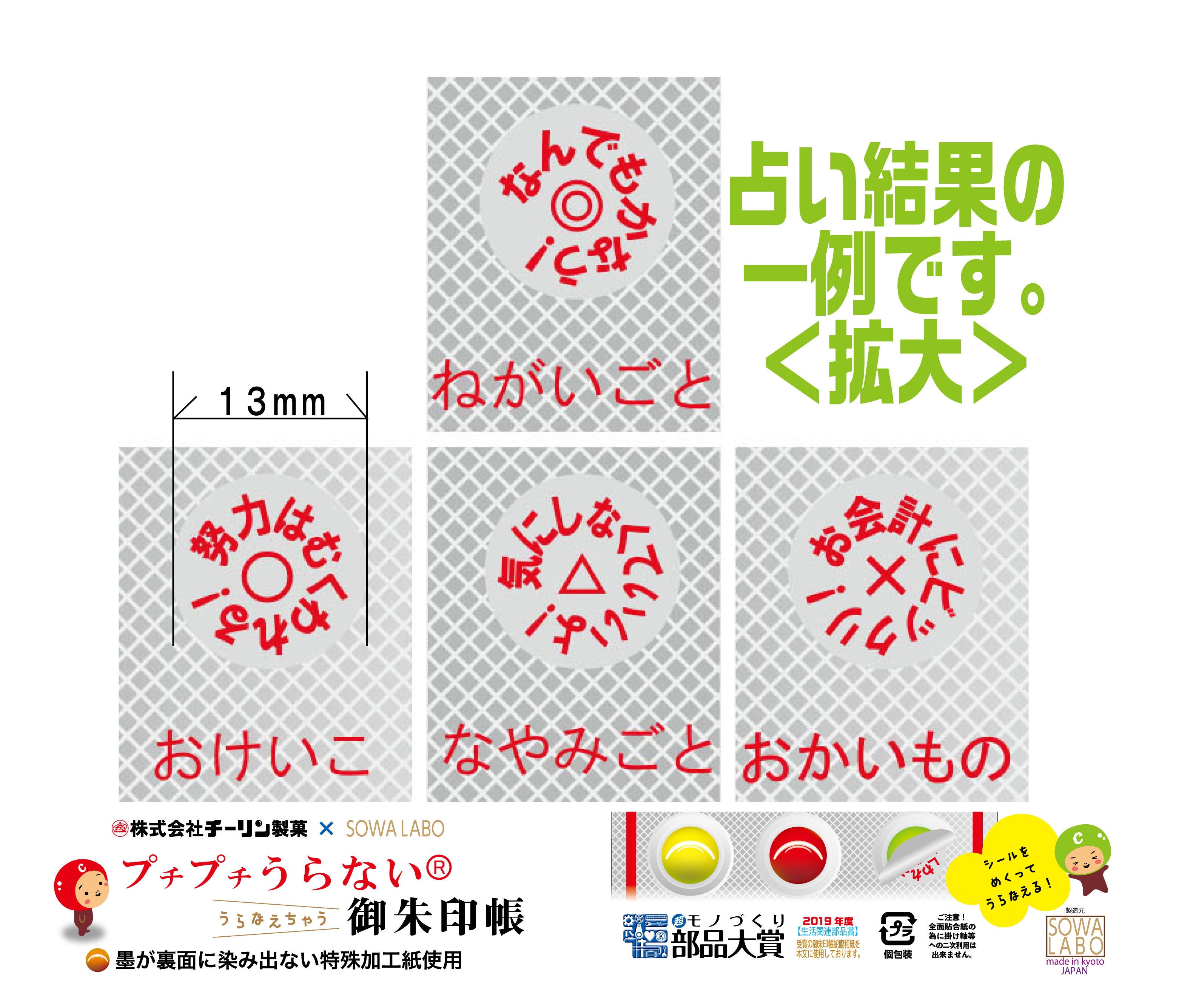 チーリン製菓とのコラボ御朱印帳発売!「プチプチうらない」が御朱印帳に!お菓子の占いでは◎○△✕でしたが、今回は “ちょっと一言” を追加しました!シールで遊びながら御朱印巡りをお楽しみください。