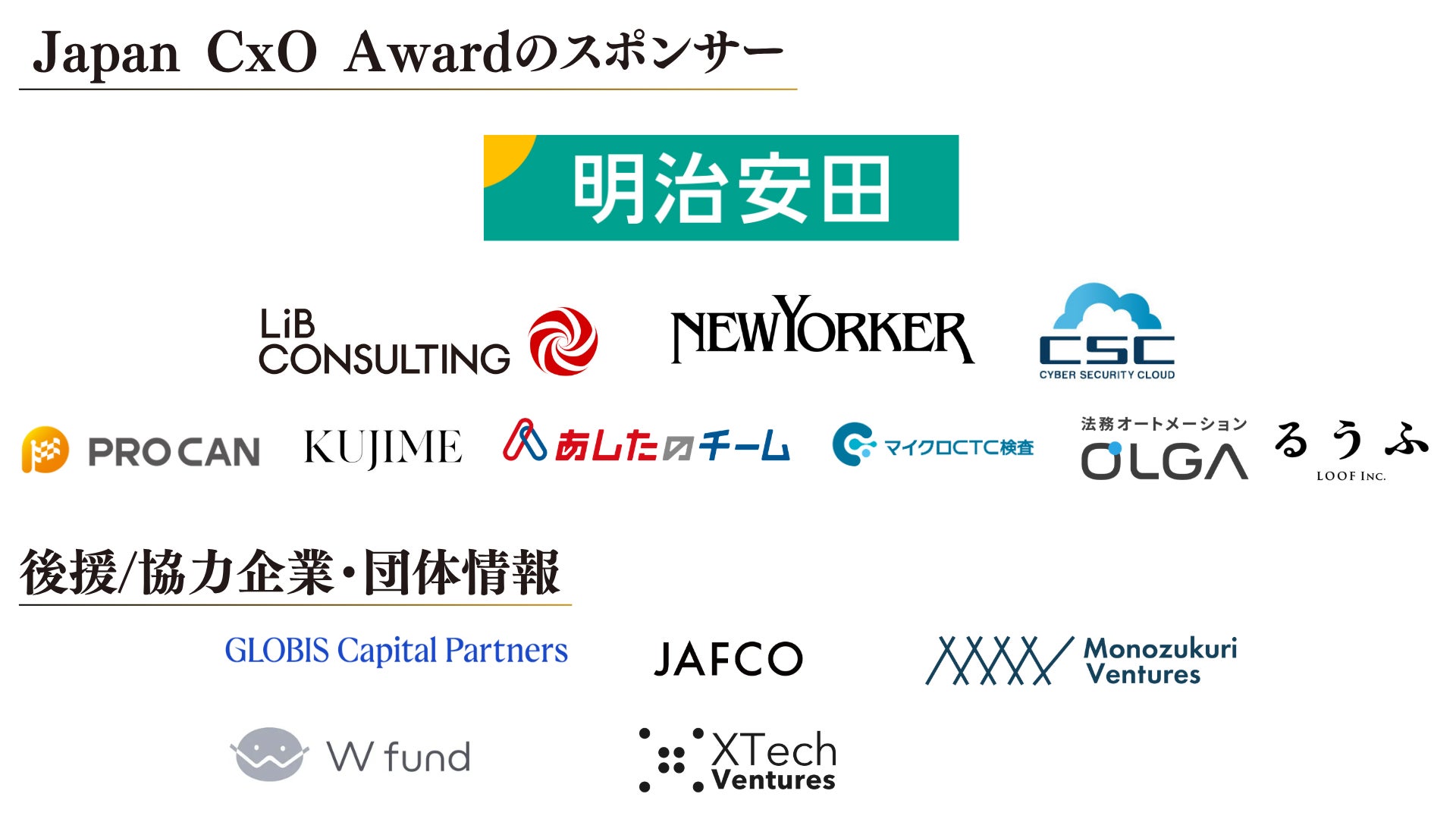 本アワードは、明治安田様をはじめ、以下の企業の皆様にスポンサーとして、また、団体様に後援としてご賛同いただき、本活動を多方面からご支援いただいております。
