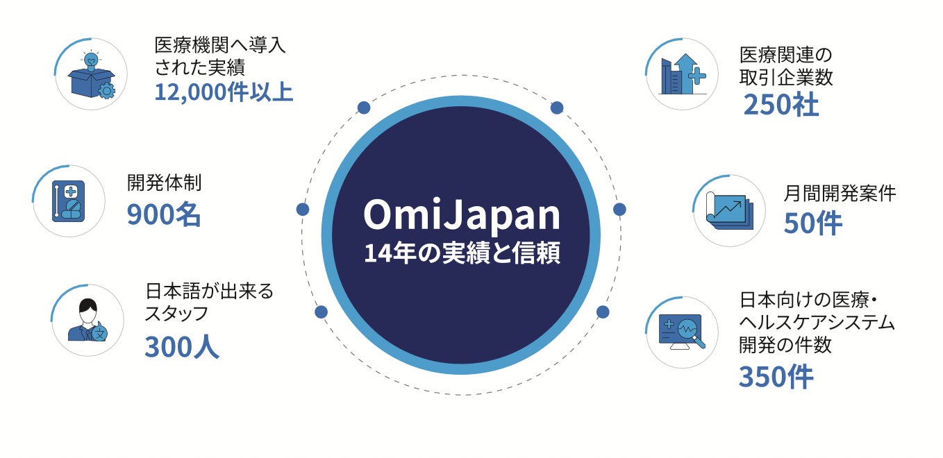 Omi Japan株式会社は日本向けの医療・ヘルスケアシステム開発に特化したオフショア企業です。13年以上の豊富な経験を有し、これまでに350以上のシステムを開発、病院・薬局など累計1万以上の医療機関に導入実績があります。開発実績は医療機関の内部で使用するシステム・患者向けシステムのほか、臨床試験・検査、福祉分野にまで多岐に渡ります。
