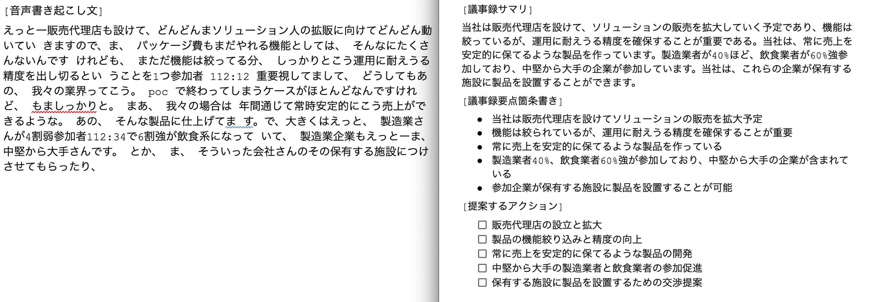 以下は、音声情報から書き起こしと議事録を行っている実際のデモです。