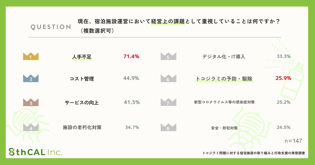 特に注目すべきは、トコジラミ対策が人手不足やコスト管理などの従来の経営課題に加わる新たな重要問題として浮上している点です。
