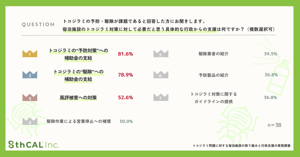 これらの結果は、トコジラミ問題が宿泊業界全体にとって深刻な課題となっており、その対策には多面的な行政支援が不可欠だと考えられていることを明確に示しています。