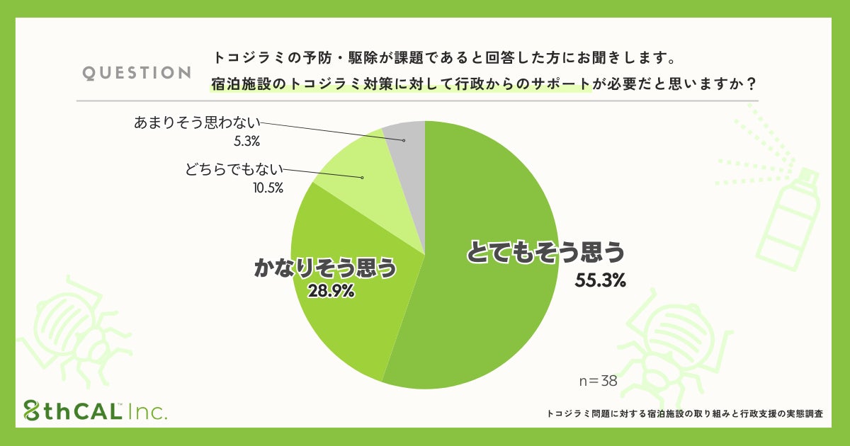 さらに同様の対象者(トコジラミの予防・駆除」を経営上の課題と感じる方)に「宿泊施設のトコジラミ対策に対する行政からのサポートの必要性」について調査したところ、その55.3%が「行政からのサポートがとても必要だ」と回答し、さらに28.9%が「かなり必要だ」と答えています。