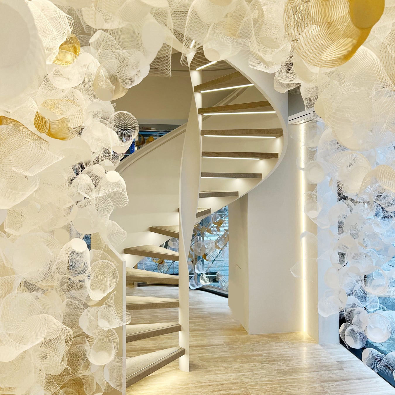 ファサードのウィンドウから眺めたときにはまるで水槽の中のクラゲのように見え、店内で近くで見ると何層にも重なる空気の器の奥から漏れ出す光の表現に心を動かされます。