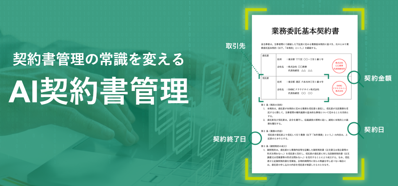 「AI契約書管理」は、三井住友銀行とSMBCCSで共同開発した機能であり、クラウド型電子契約サービス「SMBCクラウドサイン」にて締結した契約書の情報を自動で抽出・登録するサービスです。本機能によって契約書管理実務の大幅な効率化や検索性・一覧性の向上を実現することが可能です。