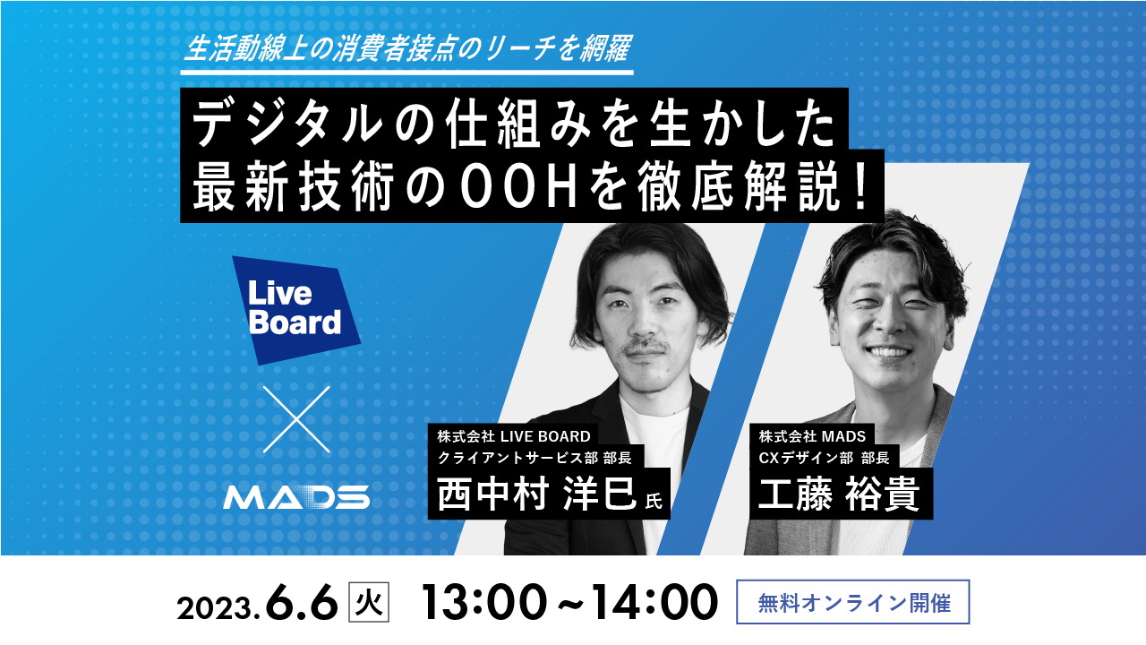本セミナーでは、消費者の生活動線にデジタルOOHの仕組みでアプローチするLIVE BOARD社と、日本最大級のドラッグストアのデジタルOOHネットワークを強みとするMADS社が、売上につながる最新のデジタルOOH活用方法を解説してまいります。