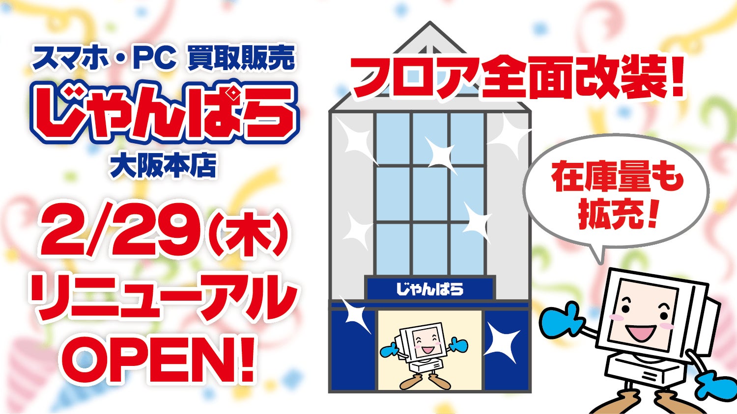 株式会社じゃんぱら(本社:東京都千代田区、代表取締役:小林 直純)が展開するスマホ・パソコンの買取・販売「じゃんぱら」は、「じゃんぱら大阪本店」を2024年2月29日(木)にリニューアルオープンいたします。