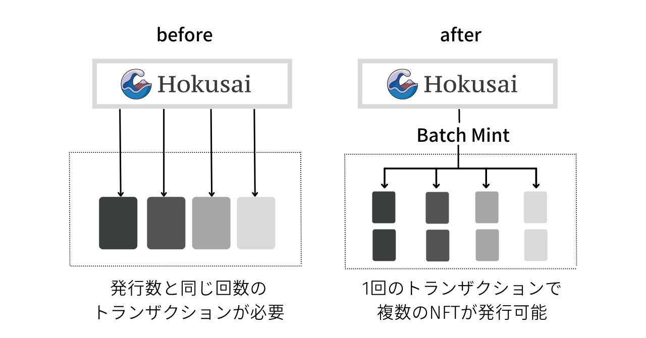 これまで開発されてきたNFTの規格は、1つのトランザクションで1つのNFTを発行することしかできませんでした。Hokusaiにおいても、大規模なNFTの発行をするにあたってmint毎にGAS代(取引手数料)がかかっており、トランザクションも多くなることからトランザクションの詰まりが発生する可能性がありました。今後、大規模なNFT発行も予想されることから、より快適にHokusaiをご利用いただけるよう、Batch Mintを導入する運びとなりました。