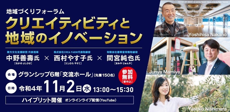 本フォーラムでは、地域の価値を高める企業経営を実践している方々をお招きし、企業のクリエイティビティと地域のイノベーションについてお話を伺います。