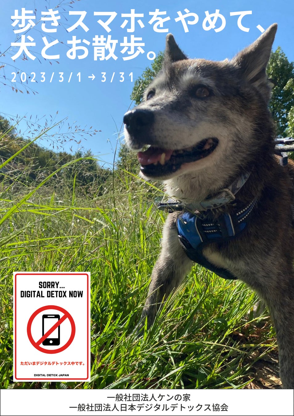2023年3⽉1⽇から3⽉31⽇まで、一般社団法人ケンの家と一般社団法人⽇本デジタルデトックス協会は『歩きスマホをやめて、⽝とお散歩。』キャンペーンを実施します。ぜひご賛同いただき、春のお散歩をお楽しみください。