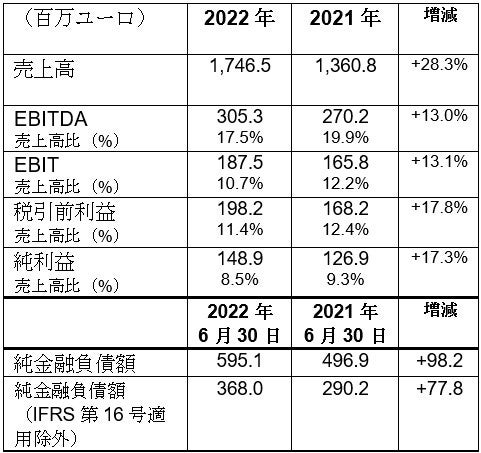 売上高1,746.5百万ユーロ(2021年上期の28.3%増)。EBITDA、EBITいずれも13%増。 純利益17.3%増。