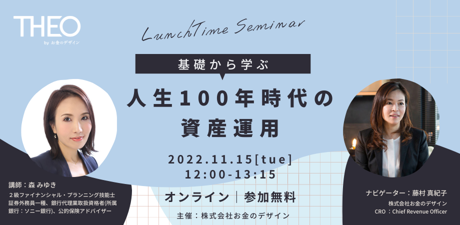 株式会社お金のデザイン(本社:東京都千代田区、代表取締役社長:山辺 僚一)は、来たる11月15日(火)に、お金を学ぶランチタイム勉強会「基礎から学ぶ!人生100年時代の資産運用」をオンラインで開催いたします。