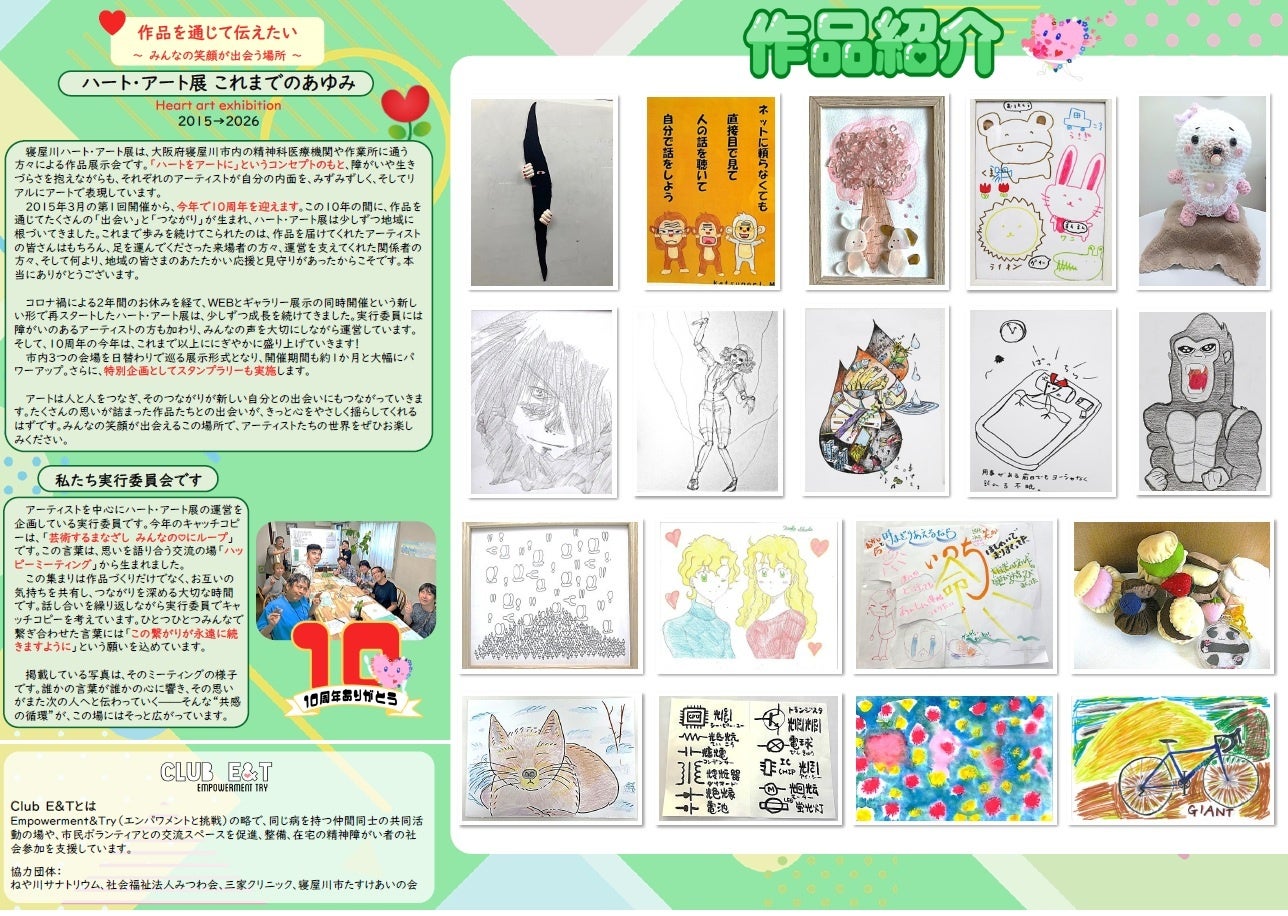 2015年3月の第1回開催から、今年で10周年を迎えます。この10年の間に、作品を通じてたくさんの「出会い」と「つながり」が生まれ、ハート・アート展は少しずつ地域に根づいてきました。これまで歩みを続けてこられたのは、作品を届けてくれたアーティストの皆さんはもちろん、足を運んでくださった来場者の方々、運営を支えてくれた関係者の方々、そして何より、地域の皆さまのあたたかい応援と見守りがあったからこそです。