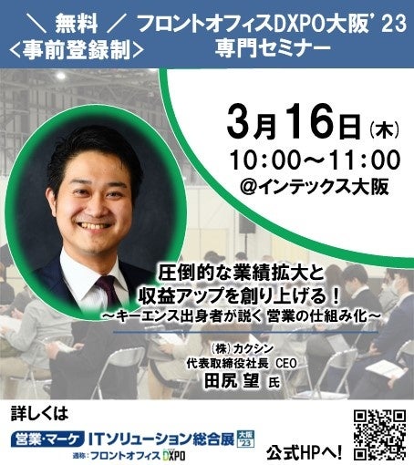 「圧倒的な業績拡大と収益アップを創り上げる!~キーエンス出身者が説く 営業の仕組み化~」と題し、【営業・マーケ】ITソリューション総合展 大阪'23 専門セミナーに、カクシン田尻望が登壇決定!