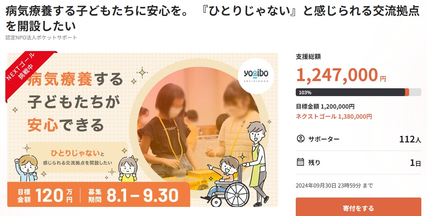 同じような療養経験のある子ども同士やご家族が集い、「ひとりじゃない」と感じられる交流拠点を開設したい。最初の目標金額120万円を達成でき、9月30日までNEXTゴールで138万円の寄付を募る。