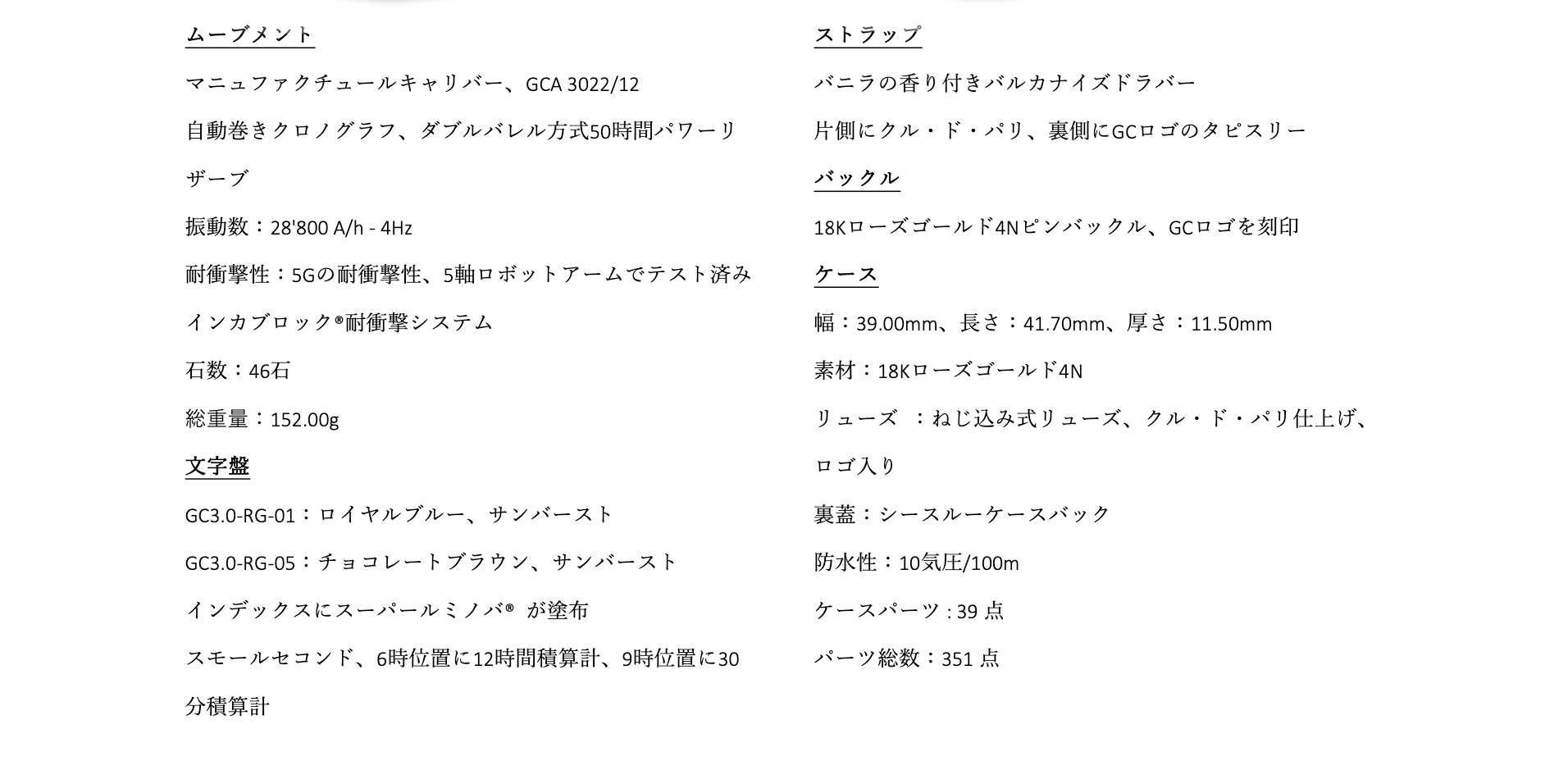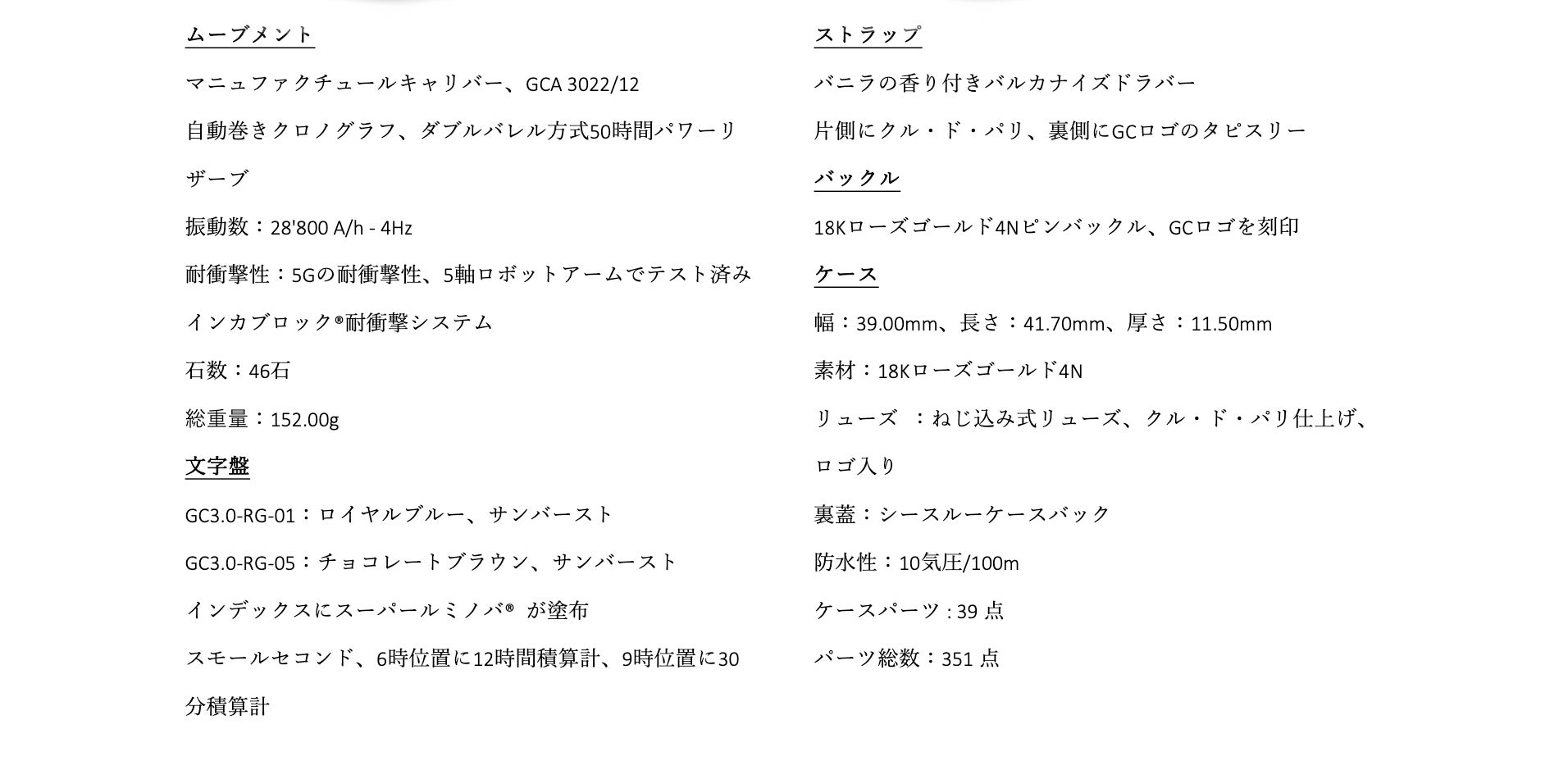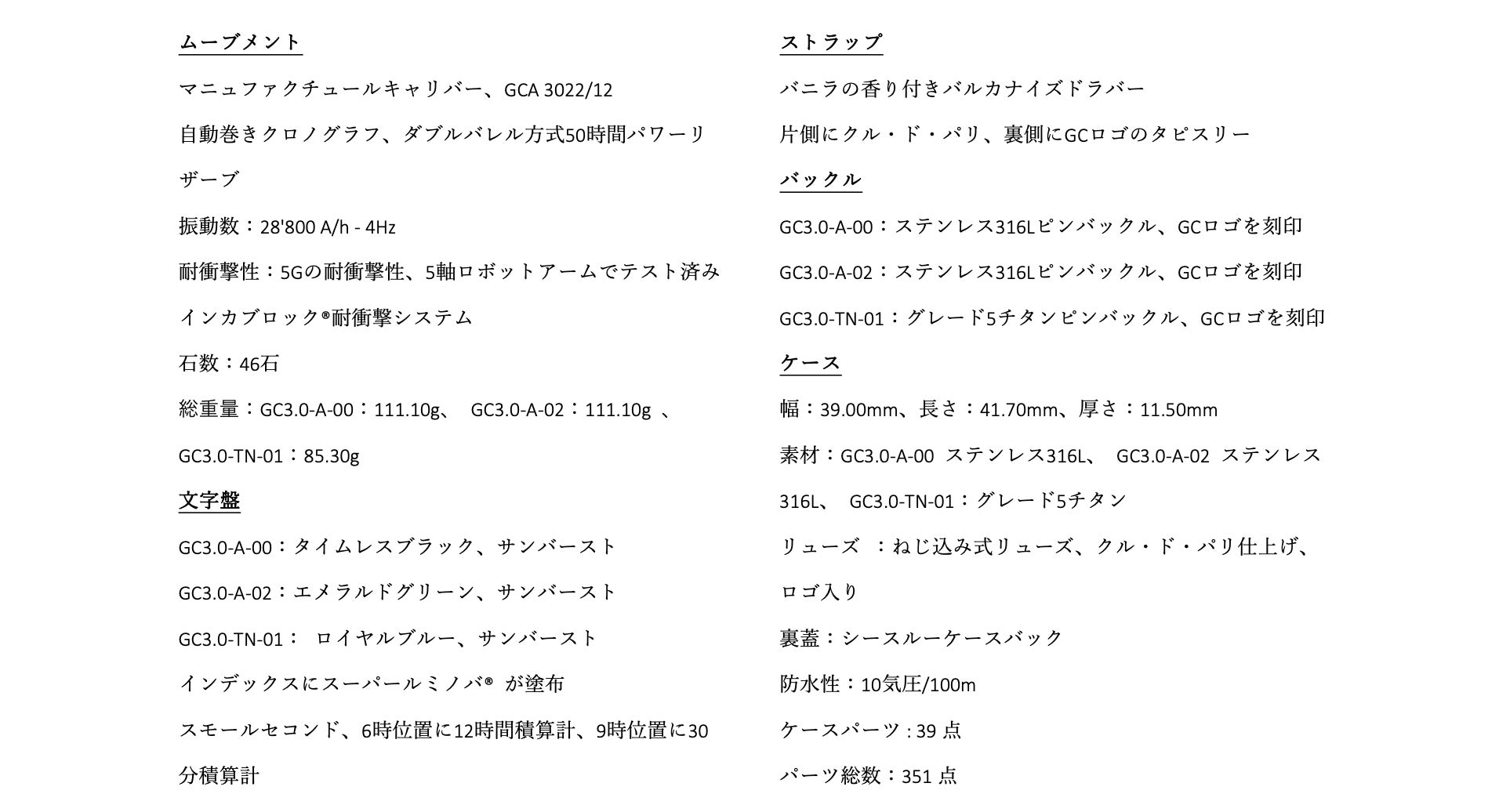 Maestro3.0 Chronograph(マエストロ 3.0 クロノグラフ)のケースは39のパーツで構成されており、CNC数値制御機械で1つずつ製造され、ケースが組み立てられます。極めて正確なエンジニアリング技術により、ケースはまるで1つのピースのように見えます。その結果、各パーツを細部まで磨くことが可能で、より明く綺麗な時計が仕上がります。さらに、スクリューダウンクラウンと特注のガスケットを使用した特別なケース構造により、100m防水性能を有します。クロノグラフにも関わらず薄さは維持されており、ヴォーシェ・マニュファクチュール・フルリエ社と共同開発された、GCA3002をベースにした自動巻きクロノグラフムーブメントを採用し、両方向回転すい車を含むプロファイルがわずか6.07mmという驚くべき薄さのキャリバーを実現しました。ツインバレルの50時間パワーリザーブ、5Gの衝撃耐性も備わっています。