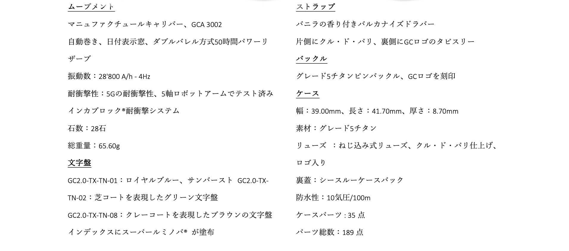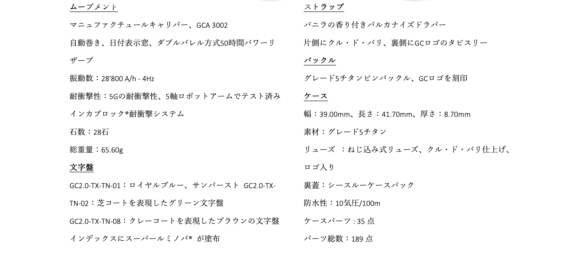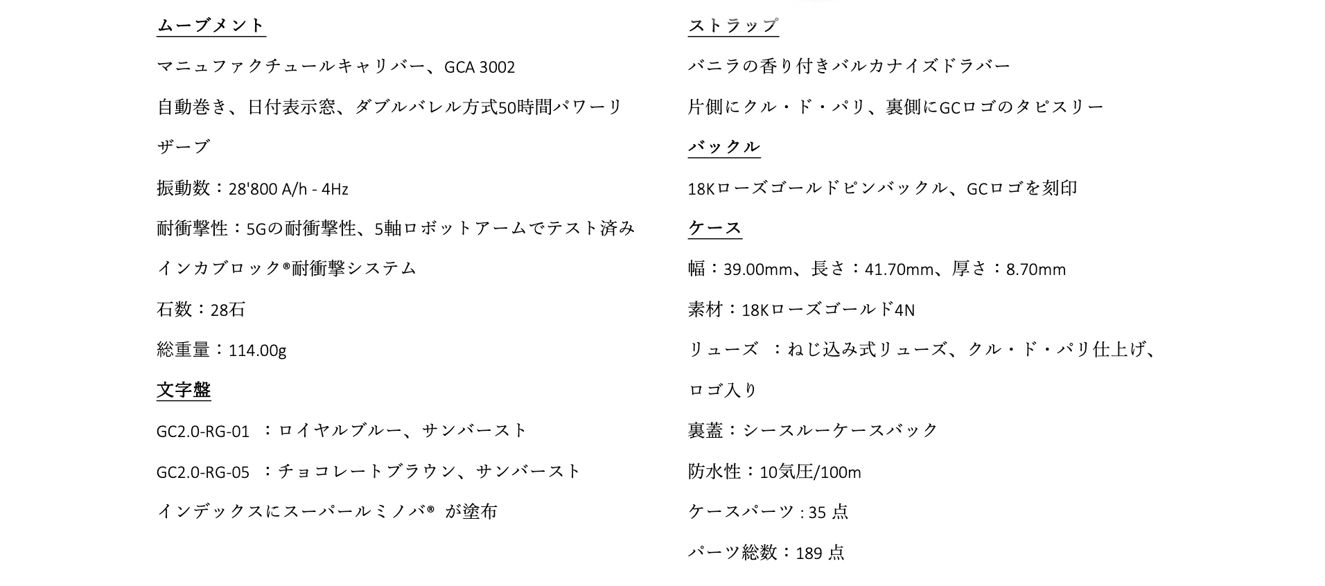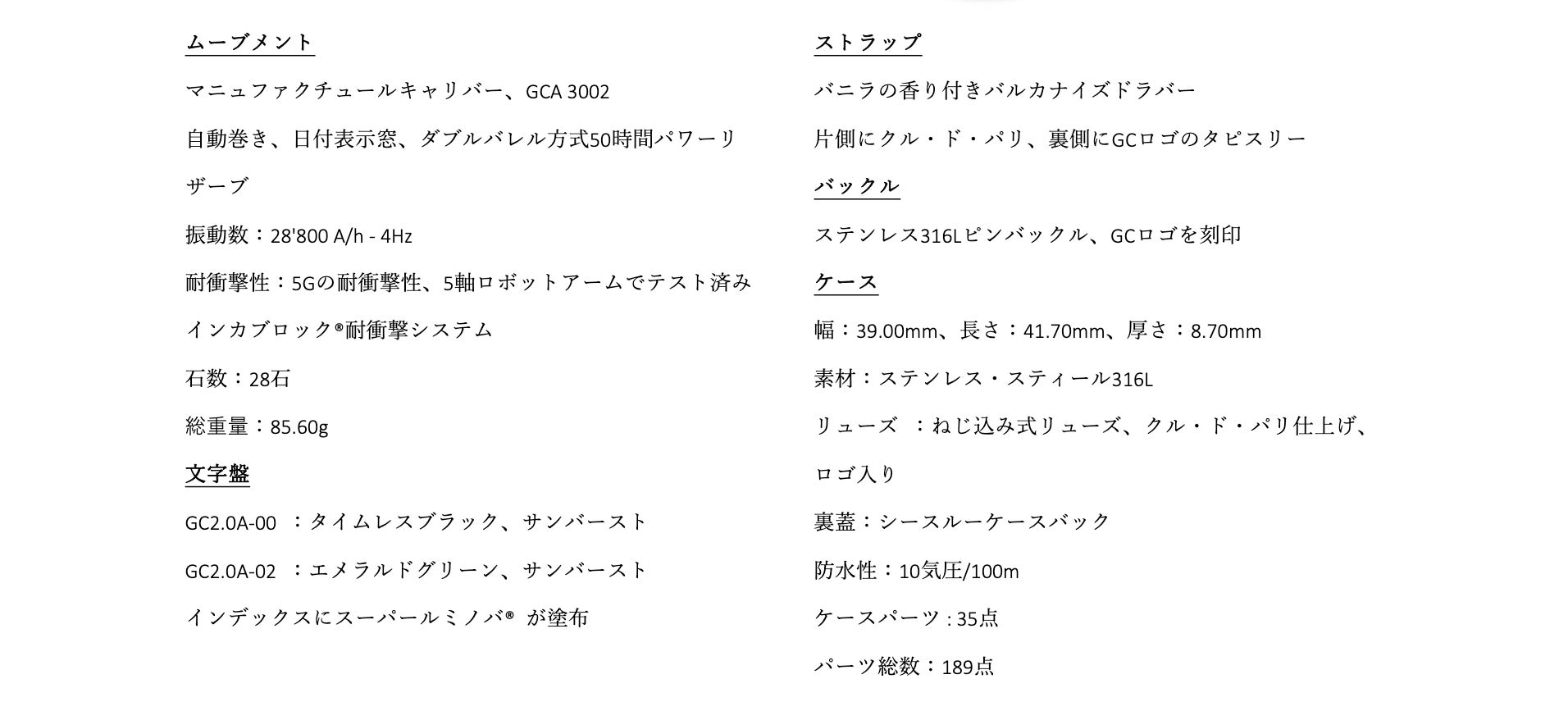 Maestro3.0 Chronograph(マエストロ 3.0 クロノグラフ)のケースは39のパーツで構成されており、CNC数値制御機械で1つずつ製造され、ケースが組み立てられます。極めて正確なエンジニアリング技術により、ケースはまるで1つのピースのように見えます。その結果、各パーツを細部まで磨くことが可能で、より明く綺麗な時計が仕上がります。さらに、スクリューダウンクラウンと特注のガスケットを使用した特別なケース構造により、100m防水性能を有します。クロノグラフにも関わらず薄さは維持されており、ヴォーシェ・マニュファクチュール・フルリエ社と共同開発された、GCA3002をベースにした自動巻きクロノグラフムーブメントを採用し、両方向回転すい車を含むプロファイルがわずか6.07mmという驚くべき薄さのキャリバーを実現しました。ツインバレルの50時間パワーリザーブ、5Gの衝撃耐性も備わっています。